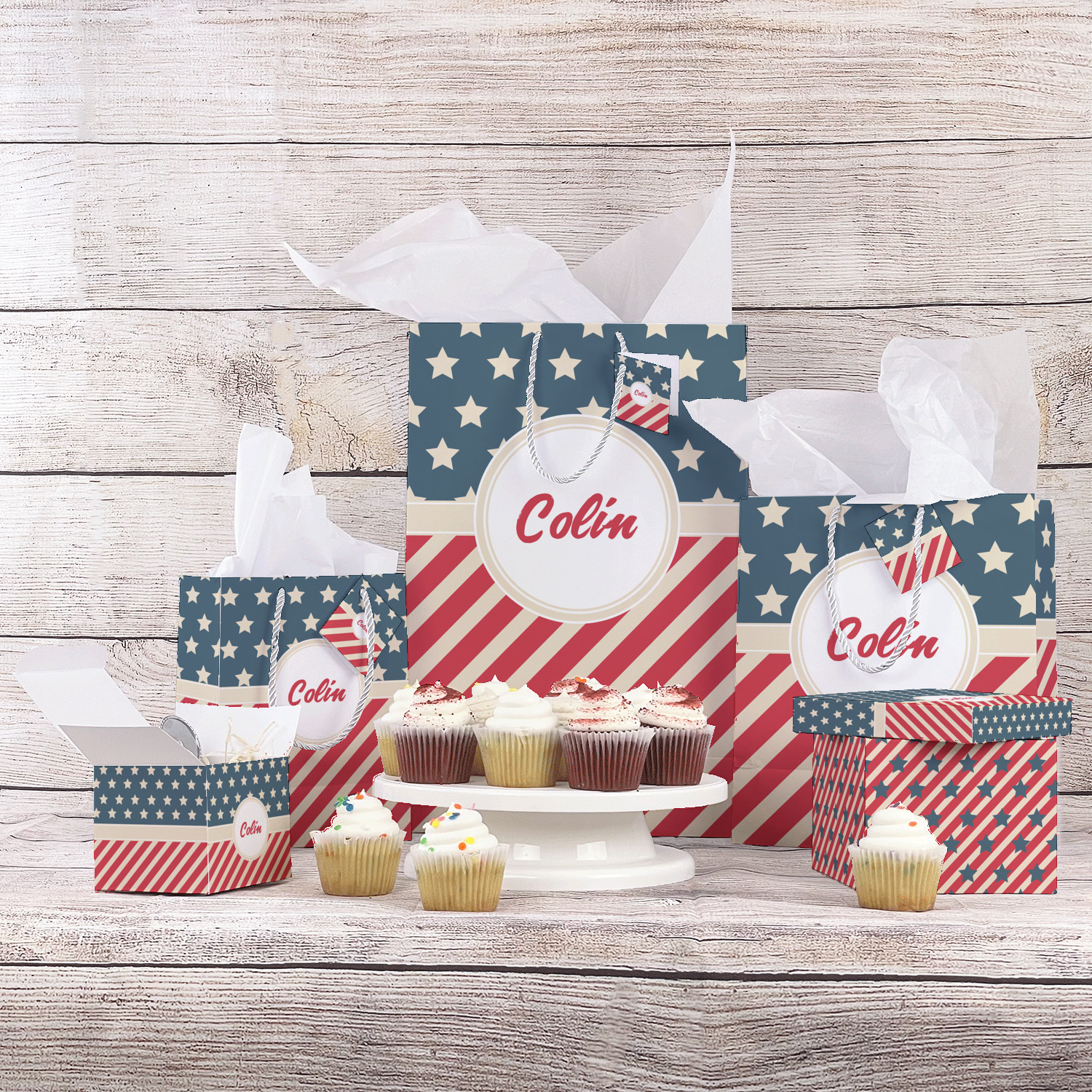 This design is a dark blue, bright red, and cream. The top half is white stars and a dark blue background, while the bottom half is a red and cream diagonal striped background. The backgrounds are divided by a cream ribbon and frame with your personalization in the middle. Have fun decorating with this classic patriotic design.