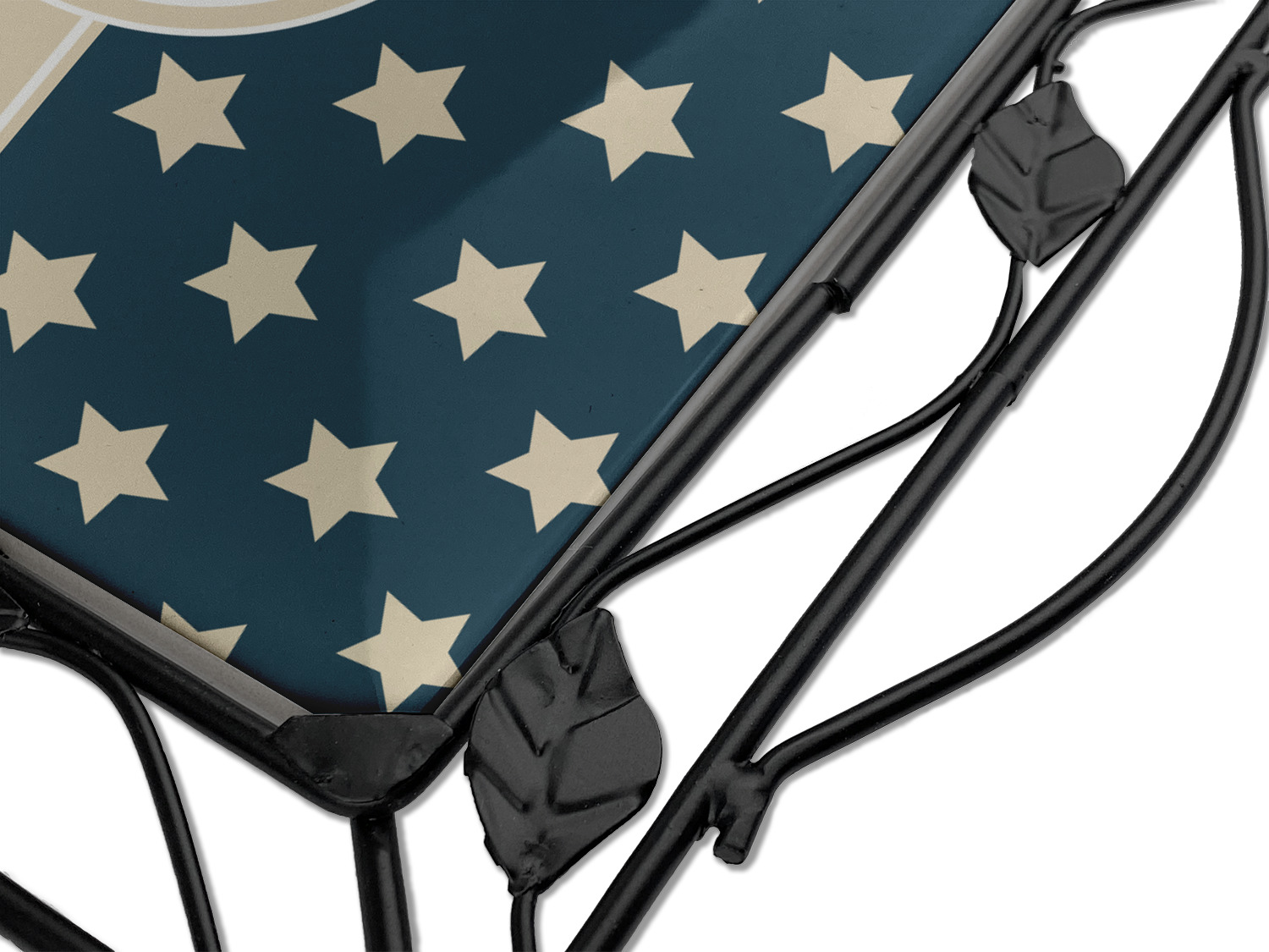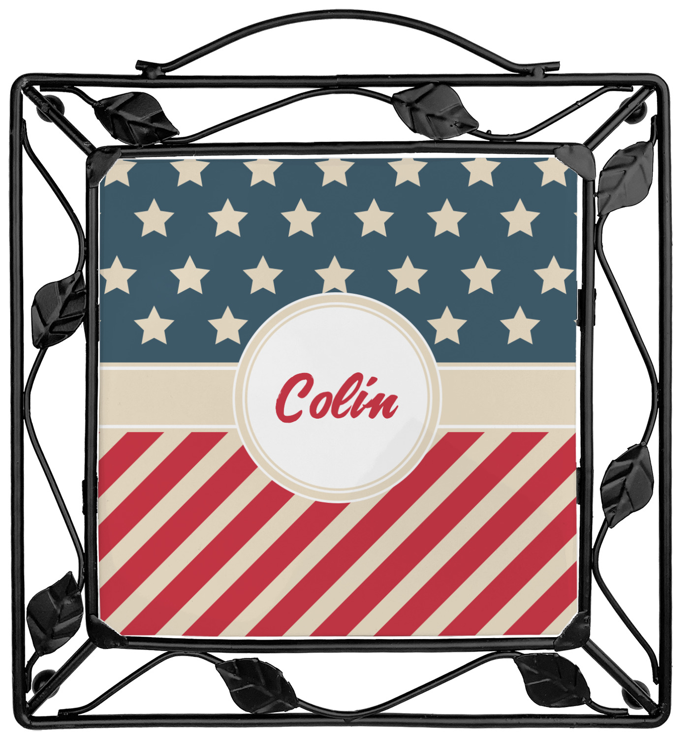 Our square trivets are made from a durable, wrought iron. This model features 4 small half circles, one on each corner, and a larger ring of iron that circles the central, customized tile. Each of the 4 corners has a round foot on its bottom for stability. This trivet is 8.75 by 8.75 inches, but the central tile measures at 6 inches on both sides.