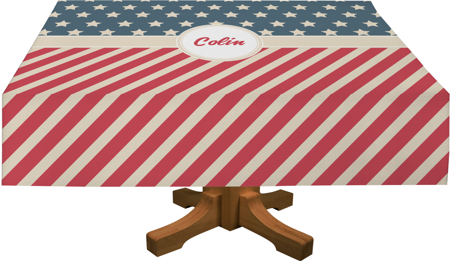 This design is a dark blue, bright red, and cream. The top half is white stars and a dark blue background, while the bottom half is a red and cream diagonal striped background. The backgrounds are divided by a cream ribbon and frame with your personalization in the middle. Have fun decorating with this classic patriotic design.