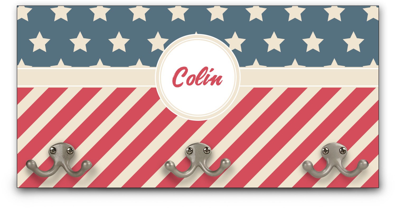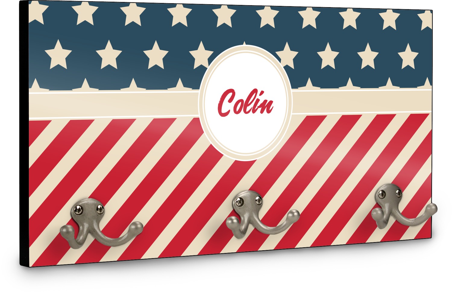 This coat rack is the perfect way to add some personality to your wall or entryway. The board is made of a strong maple that is approximately 16" x 8". The three 2-prong hooks are a sturdy metal that have three screws attaching them to the board. Your design is printed right onto the front of the board while the back and sides are a simple black.