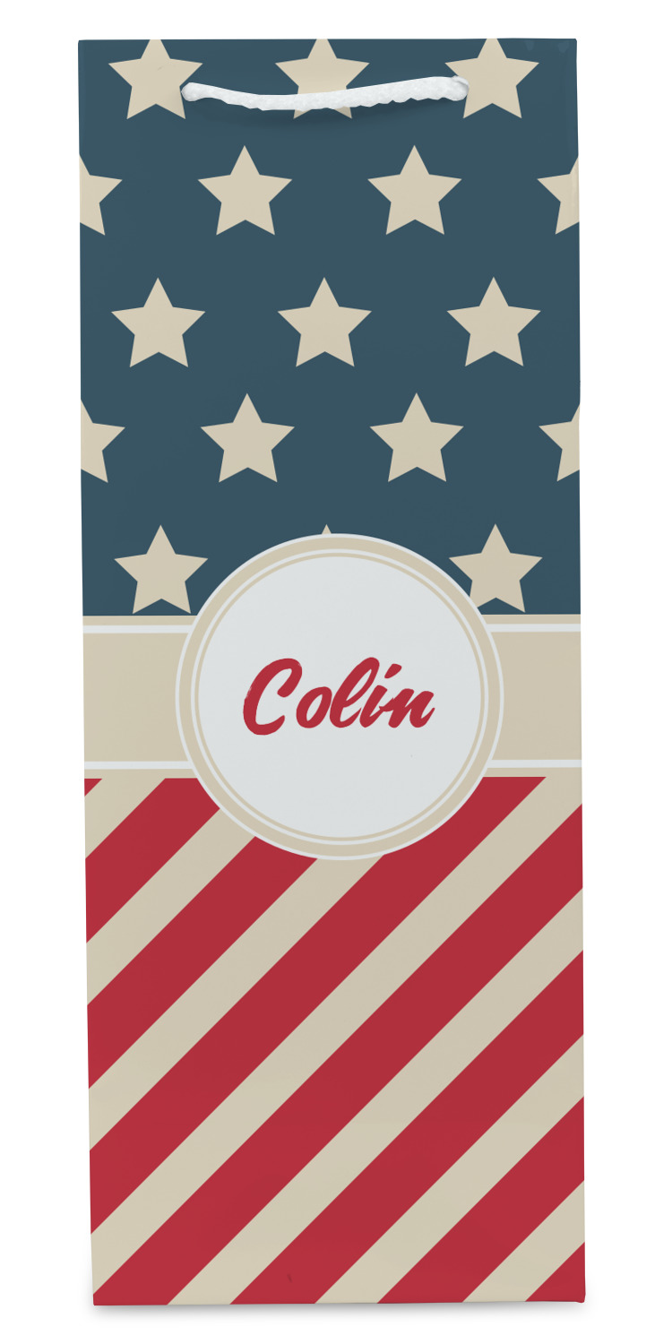 Our wine bags are printed on premium paper. The bags are then cut, scored and folded. The handles and cardstock base it attached. These custom wine bags are printed and made in the USA.