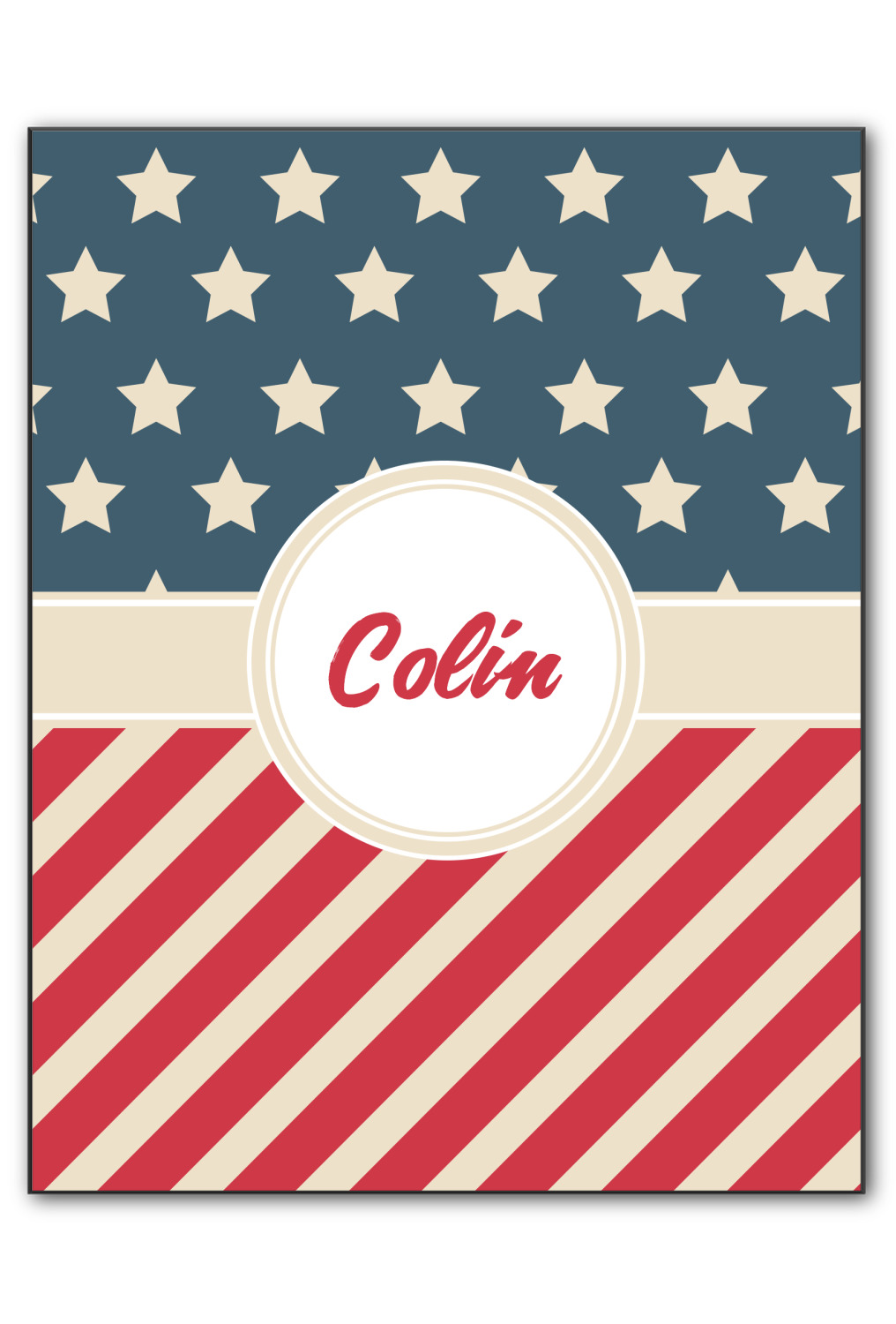 This design is a dark blue, bright red, and cream. The top half is white stars and a dark blue background, while the bottom half is a red and cream diagonal striped background. The backgrounds are divided by a cream ribbon and frame with your personalization in the middle. Have fun decorating with this classic patriotic design.