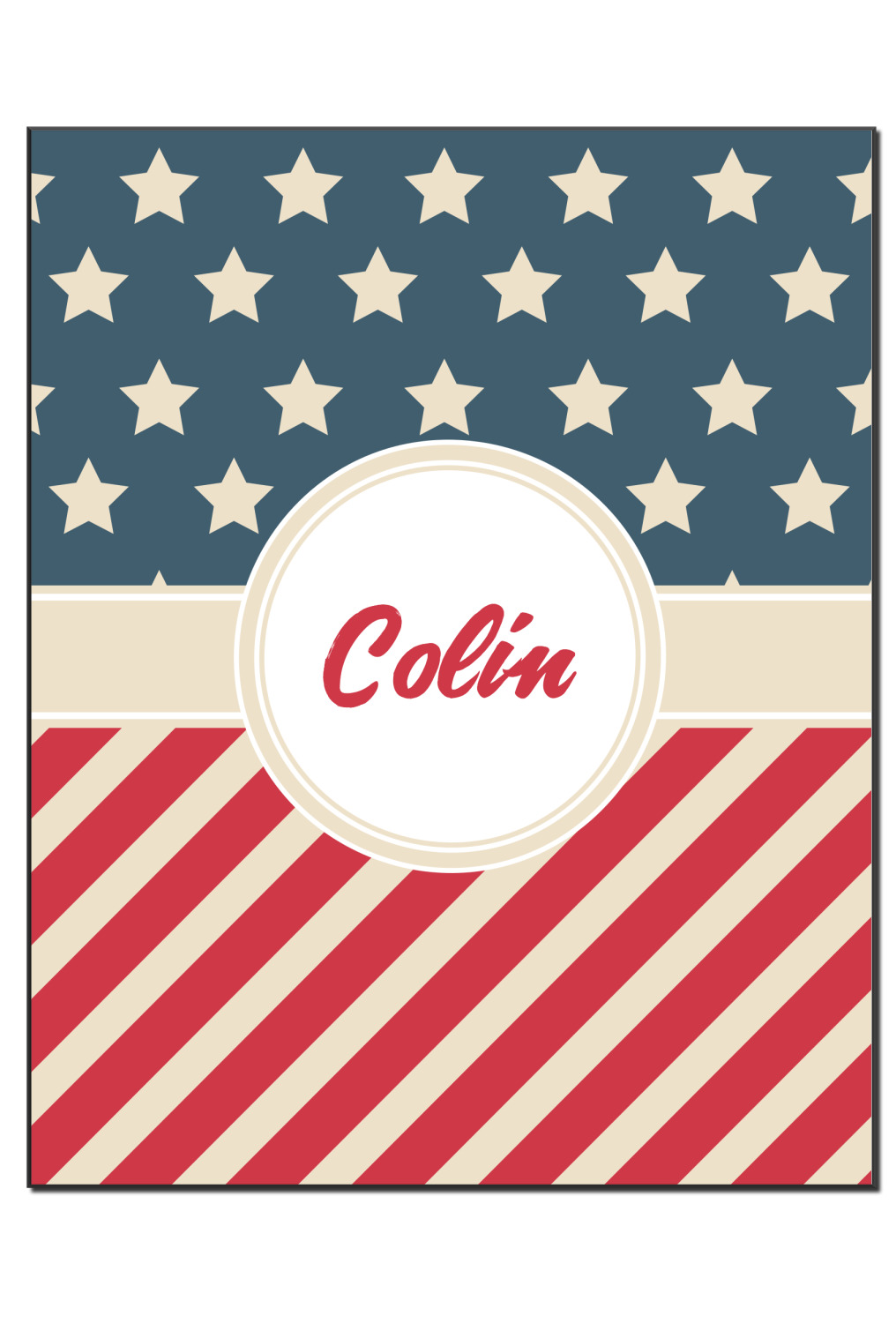 This design is a dark blue, bright red, and cream. The top half is white stars and a dark blue background, while the bottom half is a red and cream diagonal striped background. The backgrounds are divided by a cream ribbon and frame with your personalization in the middle. Have fun decorating with this classic patriotic design.
