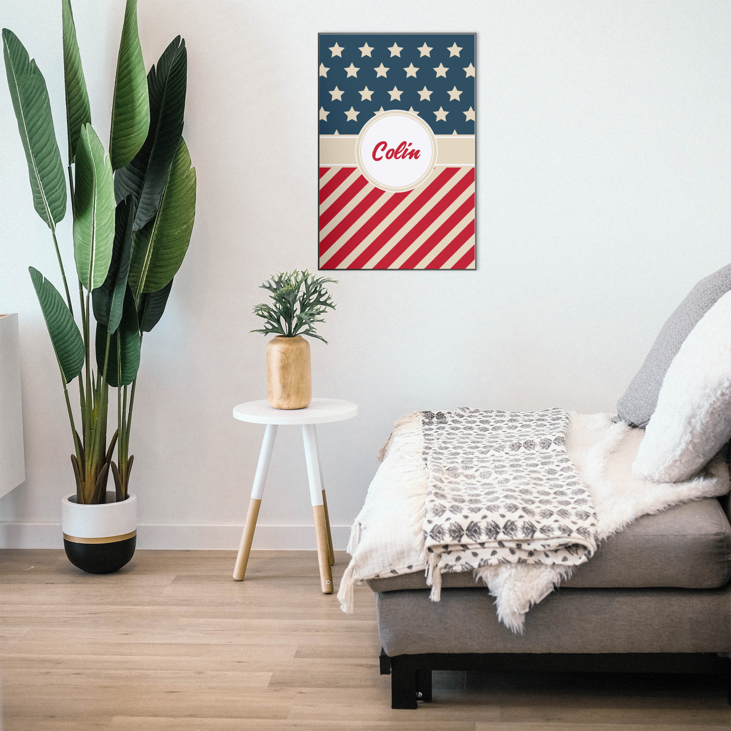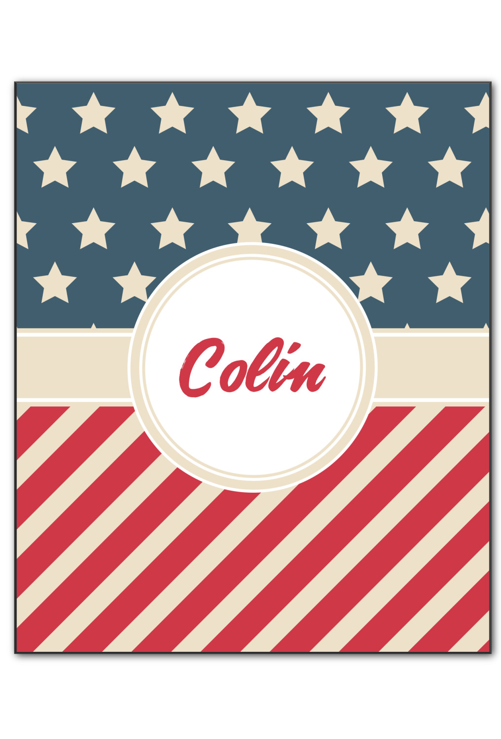 This design is a dark blue, bright red, and cream. The top half is white stars and a dark blue background, while the bottom half is a red and cream diagonal striped background. The backgrounds are divided by a cream ribbon and frame with your personalization in the middle. Have fun decorating with this classic patriotic design.