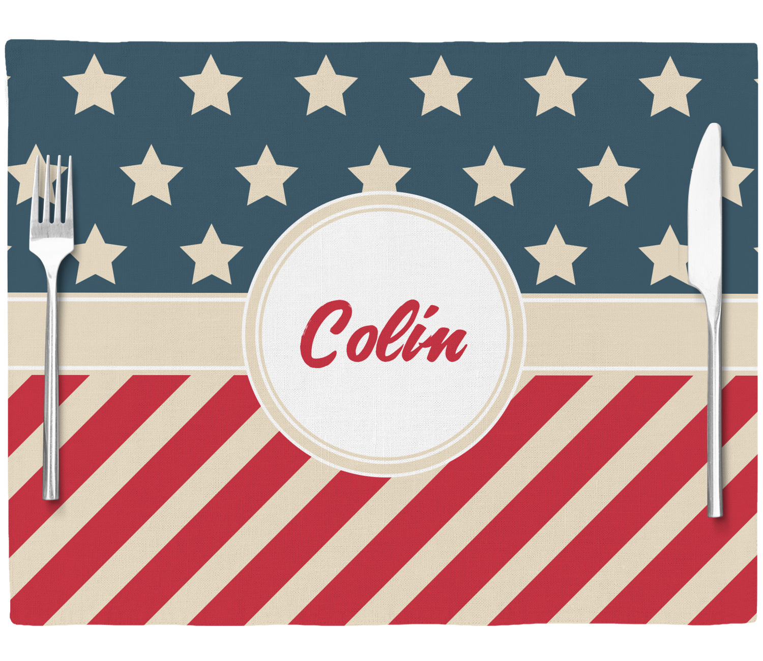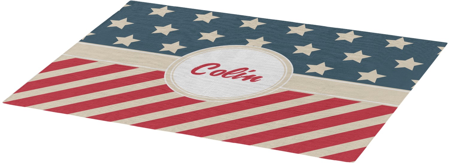 Each of our table mats are a poly twill material with woven burlap detailing. This creates a soft, quality placemat for us to fully print your personalized design across. The woven twill also adds a wrinkle-free surface to set your table! Each customizable placemat is a rectangle shape measuring at approximately 13 x 18 and printed here in the USA.