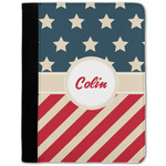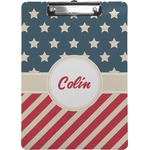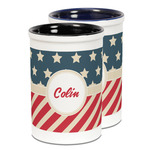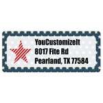 This design is a dark blue, bright red, and cream. The top half is white stars and a dark blue background, while the bottom half is a red and cream diagonal striped background. The backgrounds are divided by a cream ribbon and frame with your personalization in the middle. Have fun decorating with this classic patriotic design.