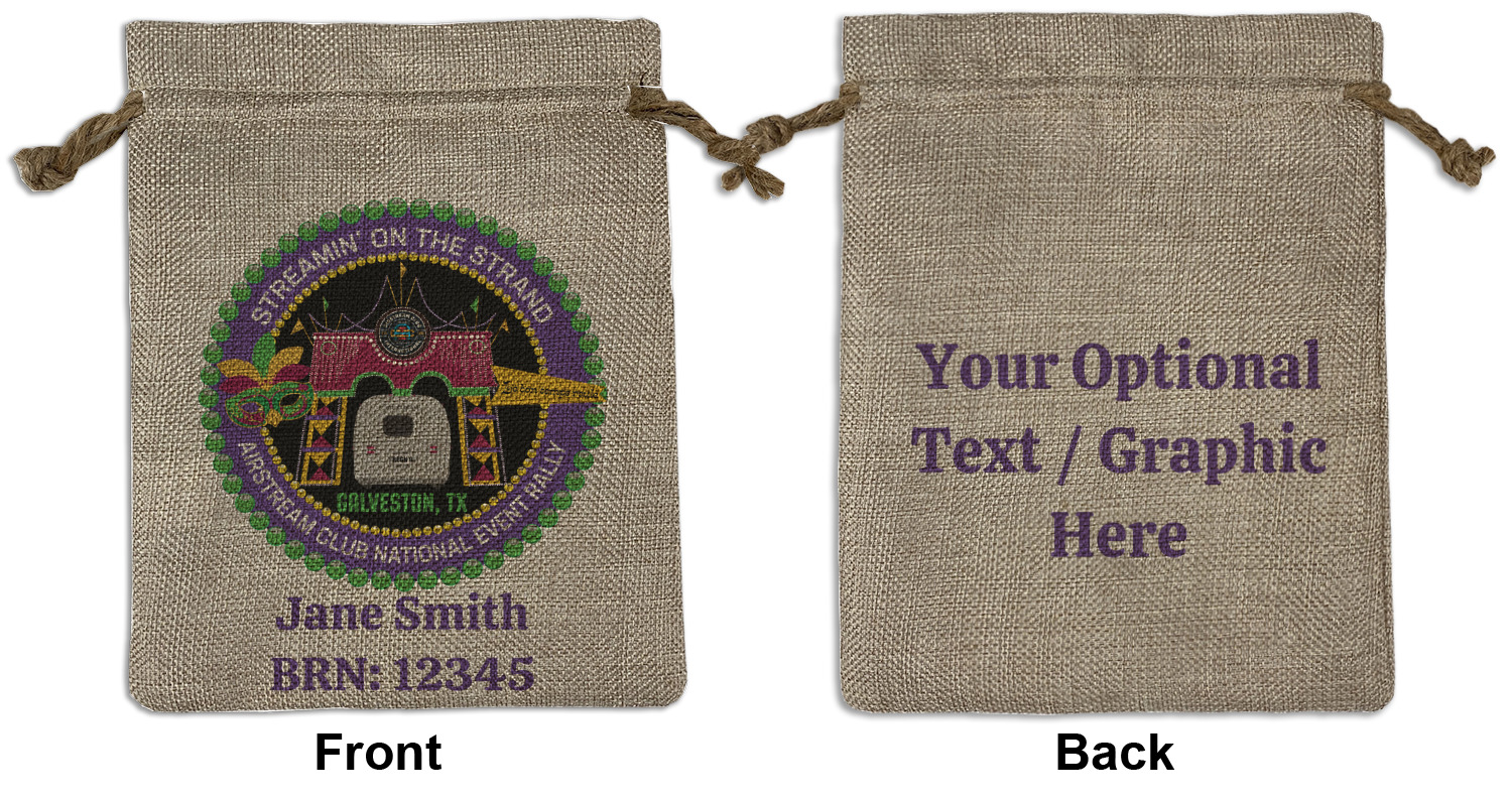 We sell our Burlap Gift Bags in 3 variant sized bags. Made with burlap polyester, each personalized bag can be secured with a twine drawstring pull. Your custom design is available to print on one side or both sides - completely up to you! The sizes of the bags measure approximately 4.5" x 6.5" for the smallest size, 6.5" x 8.0" for the medium size, and 6.5" x 13.5" for the large-sized bag.