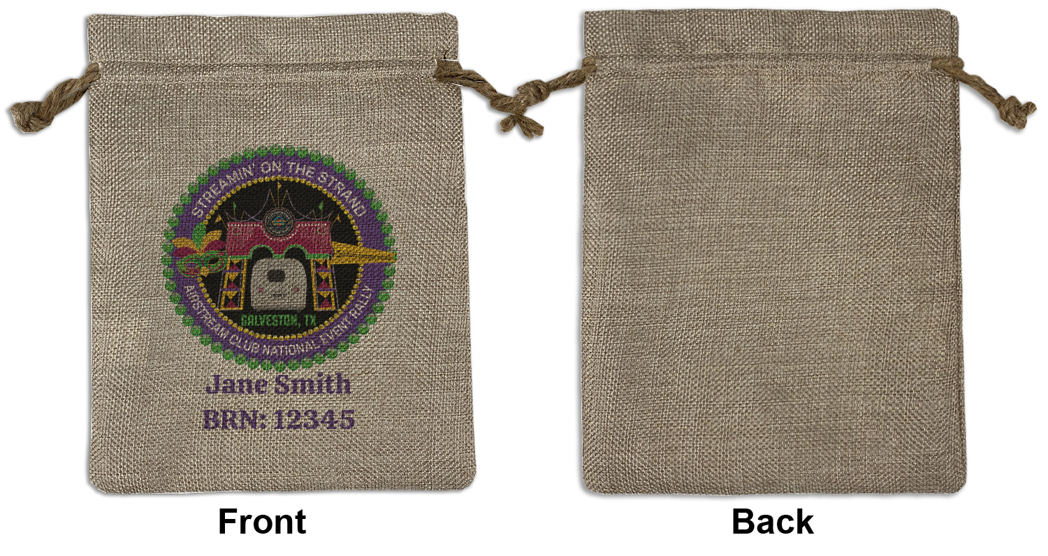 We sell our Burlap Gift Bags in 3 variant sized bags. Made with burlap polyester, each personalized bag can be secured with a twine drawstring pull. Your custom design is available to print on one side or both sides - completely up to you! The sizes of the bags measure approximately 4.5" x 6.5" for the smallest size, 6.5" x 8.0" for the medium size, and 6.5" x 13.5" for the large-sized bag.