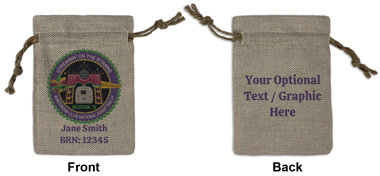 We sell our Burlap Gift Bags in 3 variant sized bags. Made with burlap polyester, each personalized bag can be secured with a twine drawstring pull. Your custom design is available to print on one side or both sides - completely up to you! The sizes of the bags measure approximately 4.5" x 6.5" for the smallest size, 6.5" x 8.0" for the medium size, and 6.5" x 13.5" for the large-sized bag.