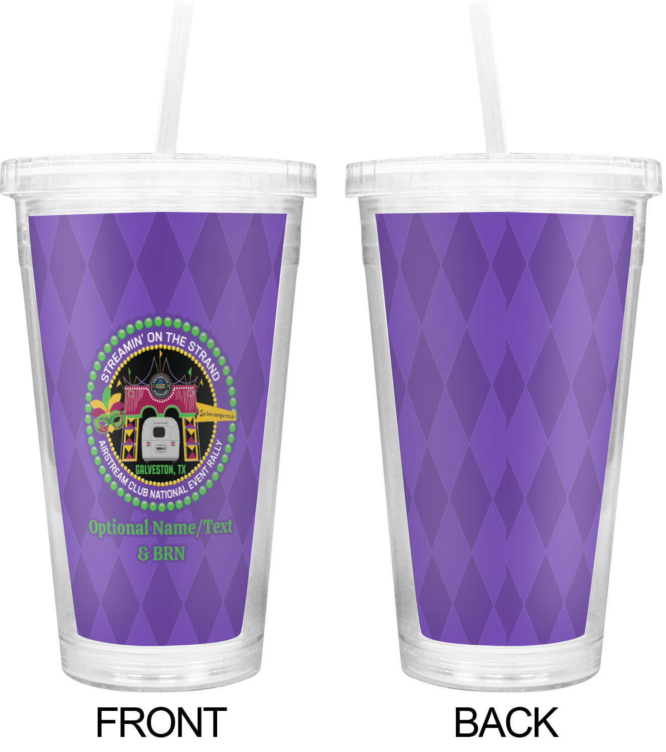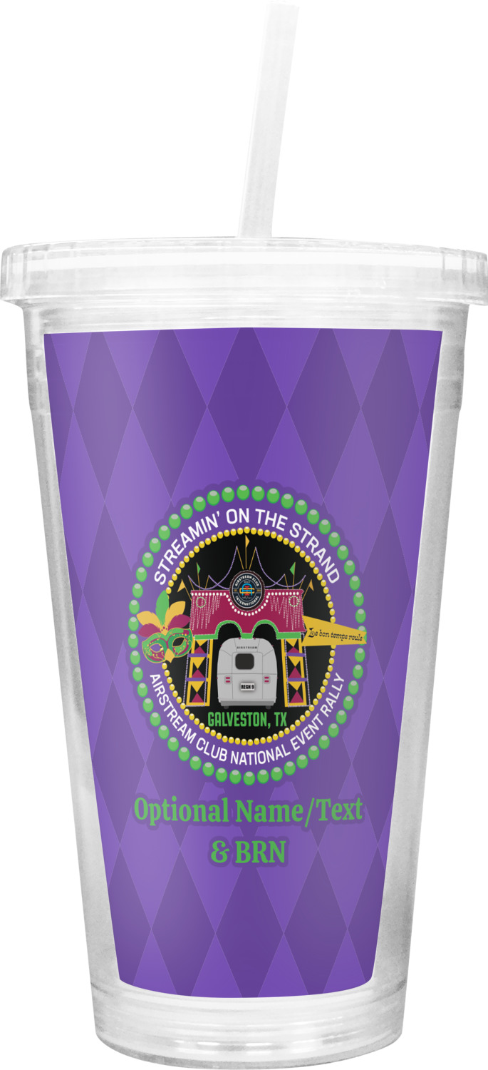 These BPA free tumblers with their double walls keep your drink cold and will not sweat on the outside; they have a clear acrylic top and a reusable straw with a ring around the bottom to keep the straw from falling out.