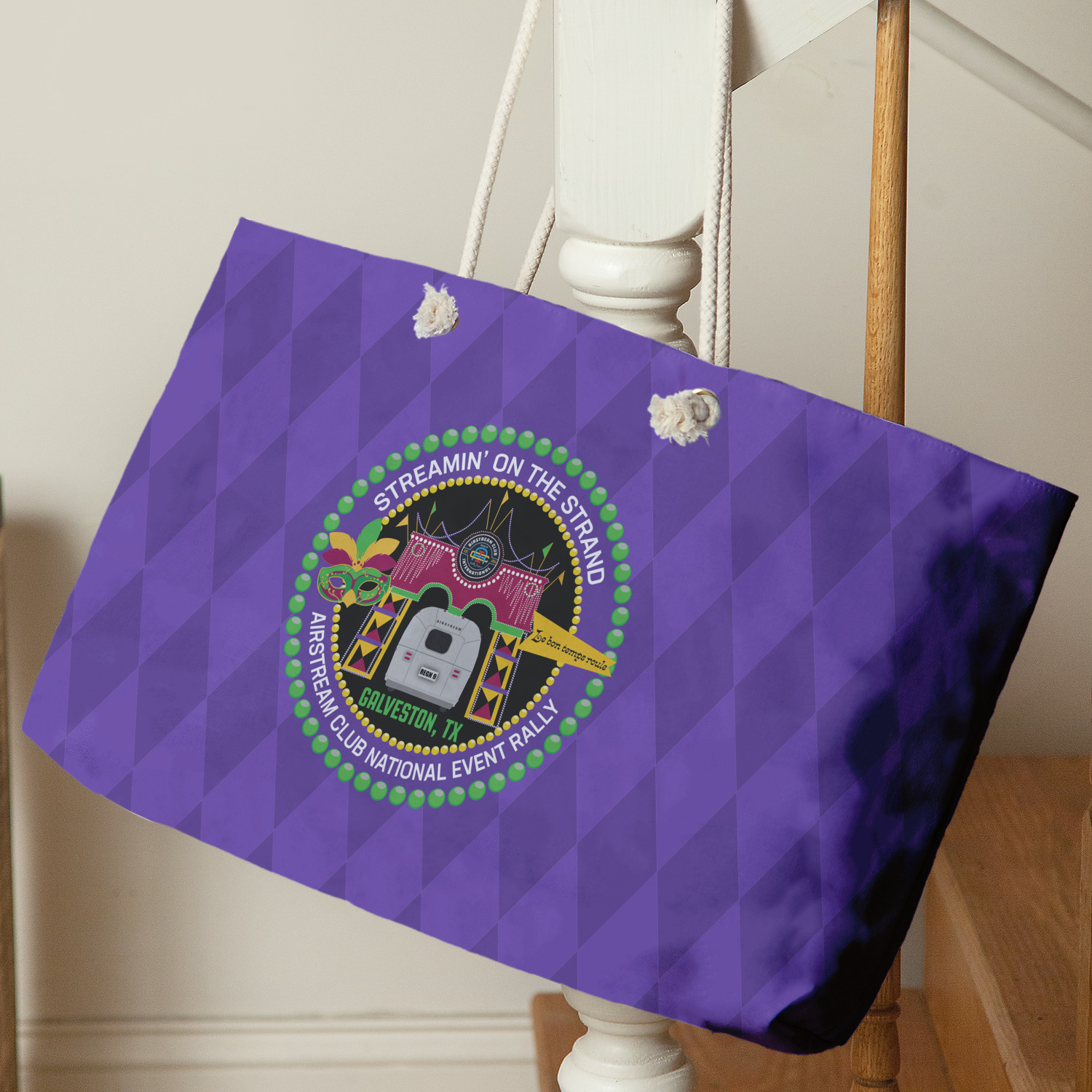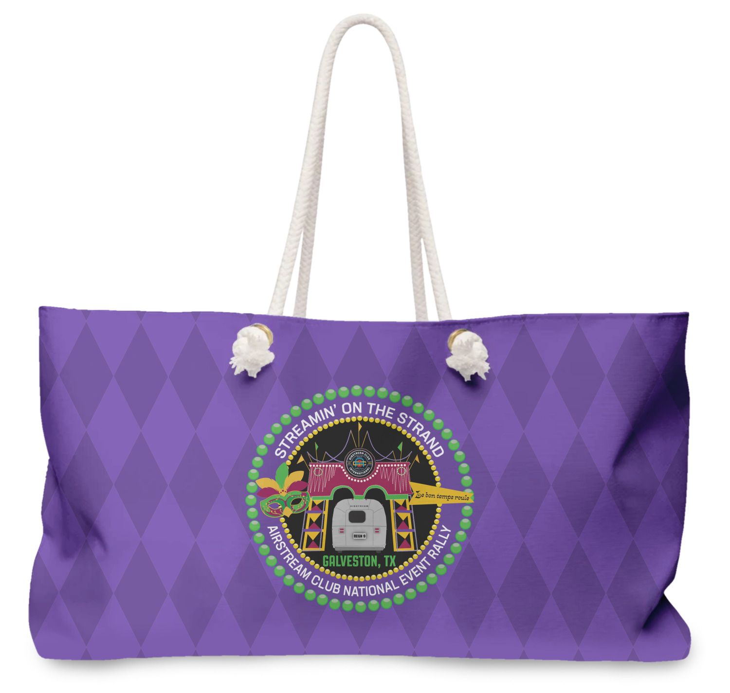 Our oversized weekender tote with rope handles is perfect for your weekend at the beach or on the town. This large tote are 24" W X 13" H, with a 5" gusset and a 27" thick rope handles with a knot that is put through a grommeted brass hole.