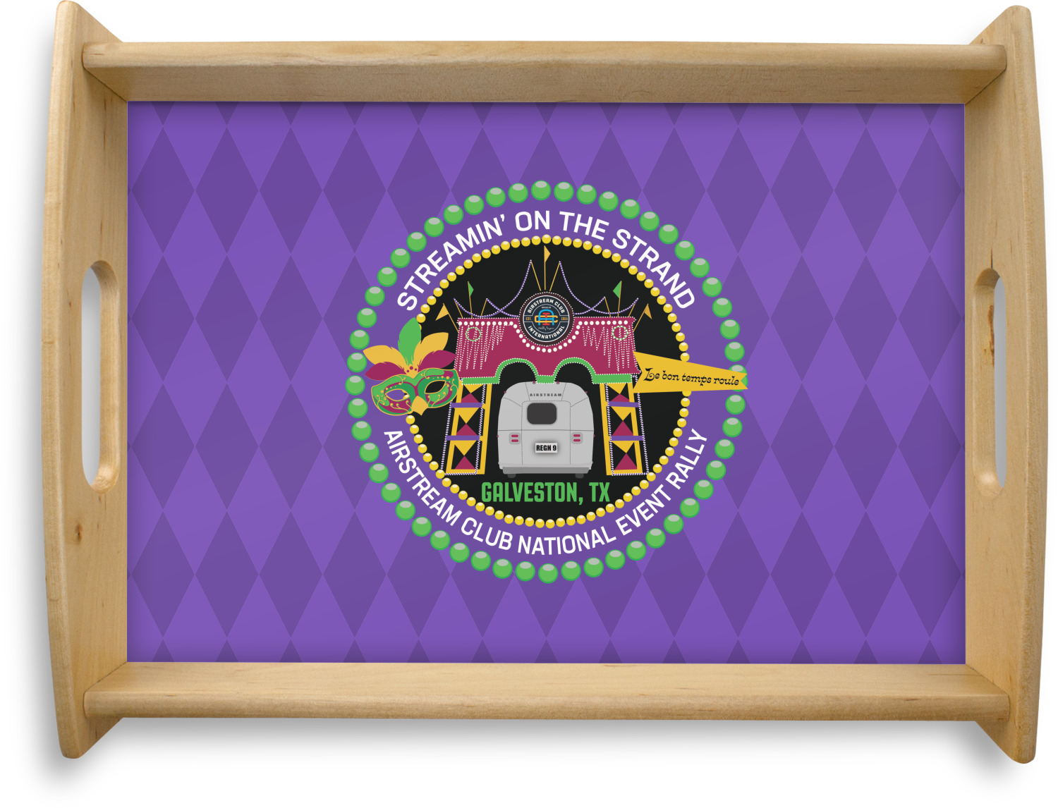 This serving tray with handles features square edges and two rounded sides, creating a very modern look. Each side is fabricated from a beautifully cut, natural wood. The bottom of the interior of the tray displays your customized design in bright, vibrant color. The tray is sold in both a black color and a natural wood look. Each variation of the wood serving tray has two sizes: Small, which is 14" x 10" x 2.25", and Large, which is 19.5" x 13.5" x 2.75".