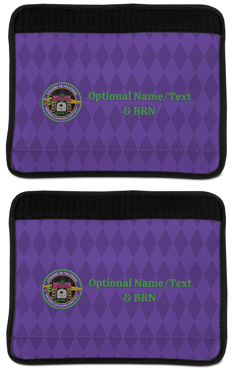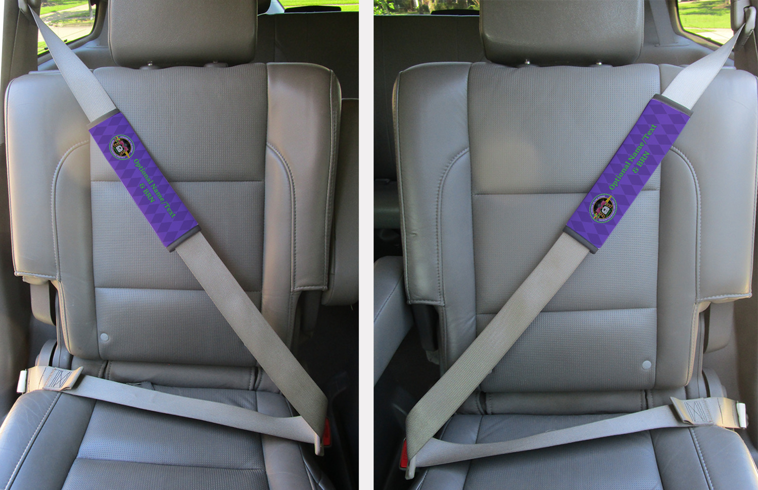 Made from neoprene, our seat belt strap covers wrap around the belt itself and have a Velcro tab for easy attachment and closure. The belt's edges are trimmed with a black polyester for a secure finish. Each cover is 9.5 by 7 inches when open and 9.5 by 2.5 inches when closed. We print your personalized design on the face of the seat belt pad.