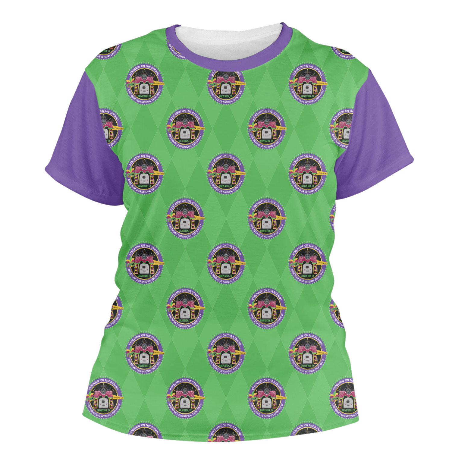 Our womens t-shirts are a lovely jersey knit polyester. They come in 6 different sizes ranging from X-Small to XX-Large. These shirts are your basic comfy crew neck t-shirts that look good on anyone. You are able to personalize the sleeves, front, AND back! Isn't that awesome?! Make everything one color or all different. The choice is yours.