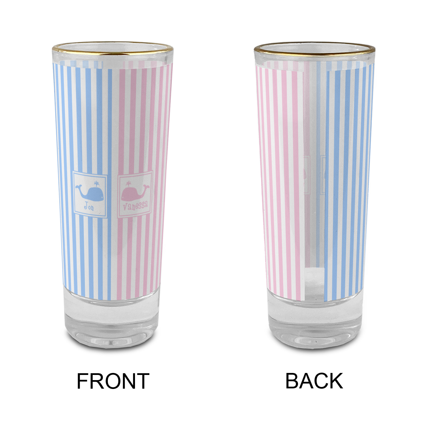 These glass shooter glasses are printed in full color with the design of your choice. These are a tall shooter 2 oz size and stand 4" tall. The print is a full wrap design to boldly display your personalization.