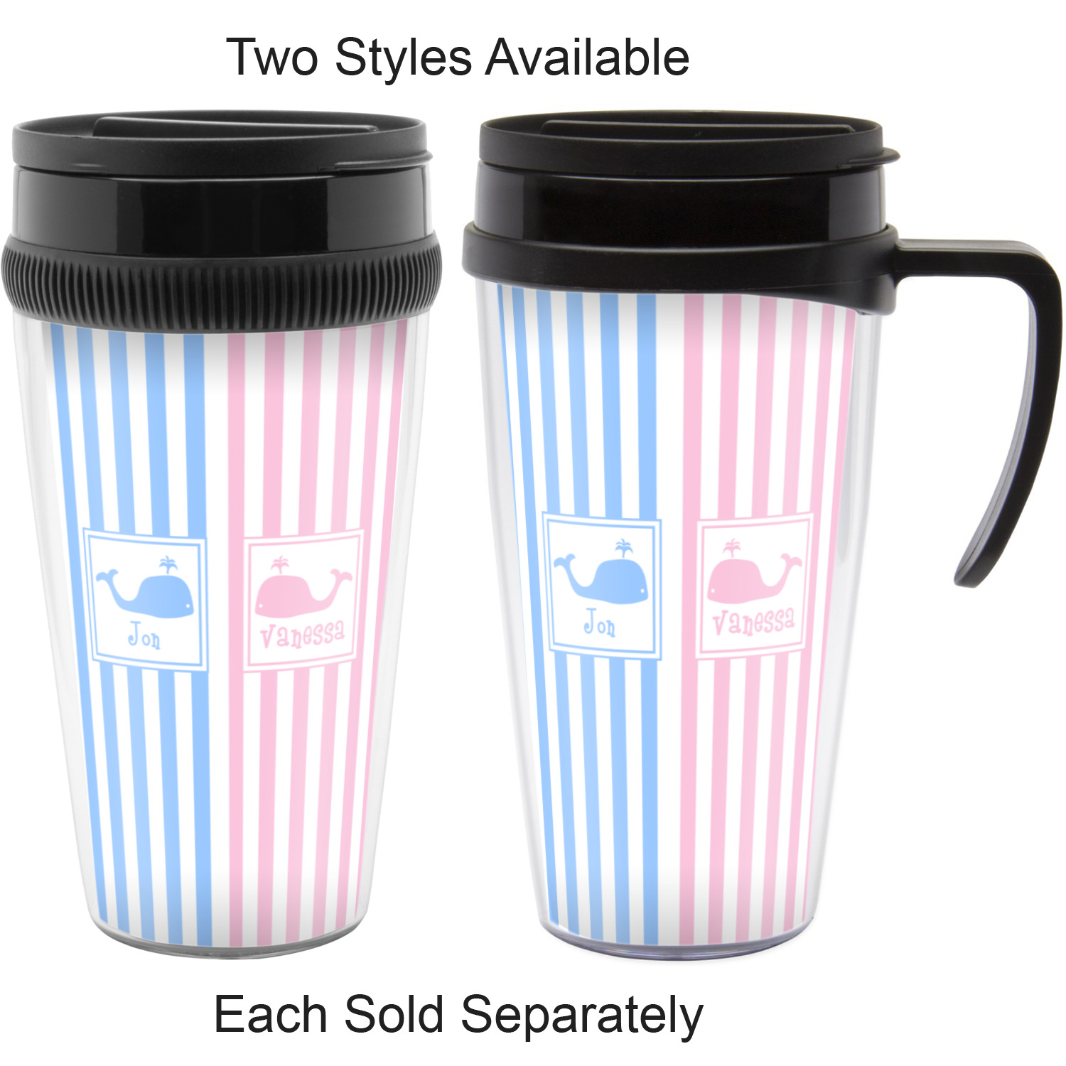 These thermal mugs are free of BPA, and insulated, to keep your drinks hot or cold. The black, snap on lid and the slider for sipping allows you to conveniently sip your drink without constantly worrying about a disastrous spill. We offer this mug with and without a handle, to better suit your needs. Each custom thermal mug holds up to 16 ounces of liquid and displays your customization on all sides on premium gloss media inserts.