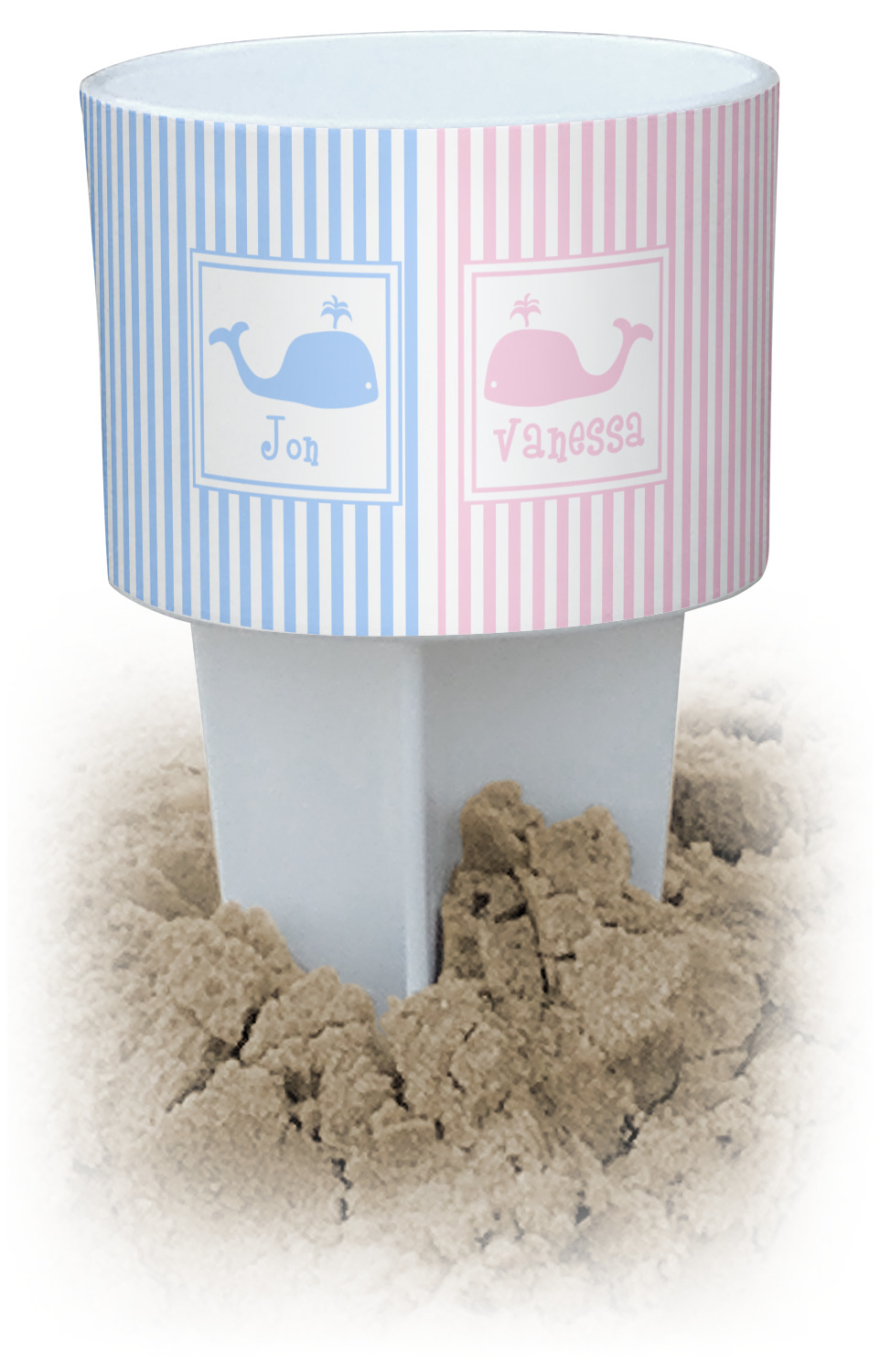 This cup holder has a large stake at its bottom that anchors it to the sand or ground below, while the cup holder rests above the stake. The entire drink holder is made of durable plastic and displays your customization around the cup holder portion. We sell these personalized beach spikers in two different colors: black and white.