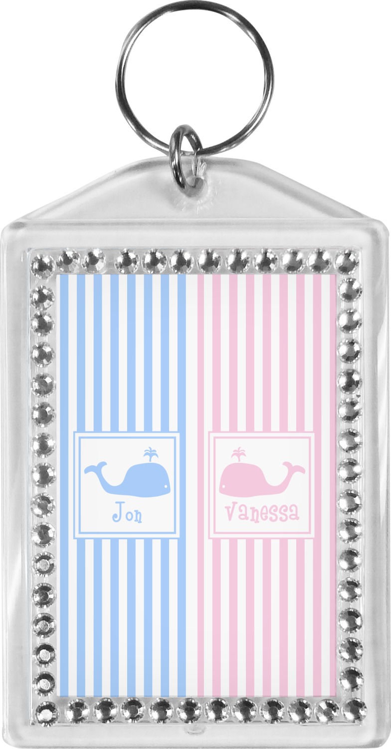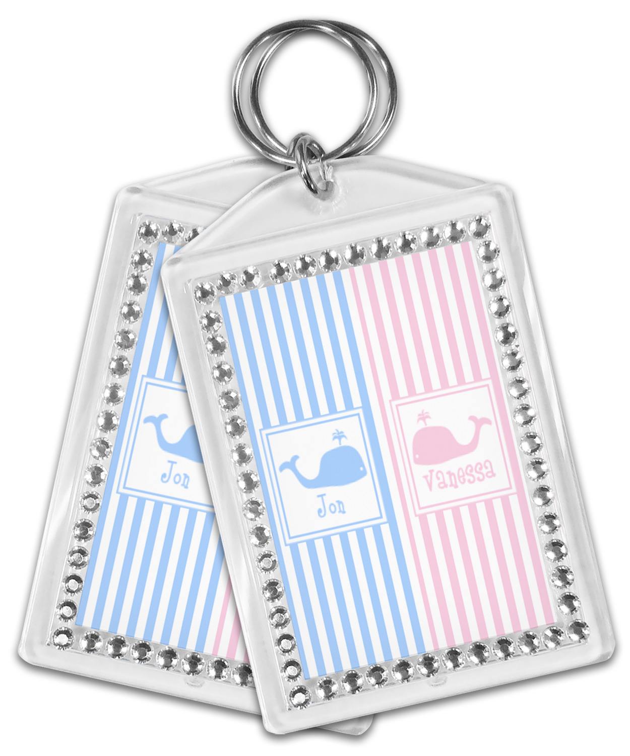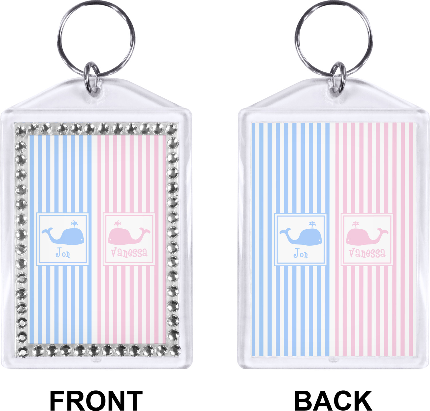 Our personalized keychains have a bold, rectangular shape, outlined by a series of shimmering rhinestones. A metal, split keyring is included with your purchase, and an additional metal hoop allows for attachment of the keychain to the split ring. This unique keychain measures at about 3.75 by 2.5 inches. We print your customized design(s) across both the back and front of this keychain.