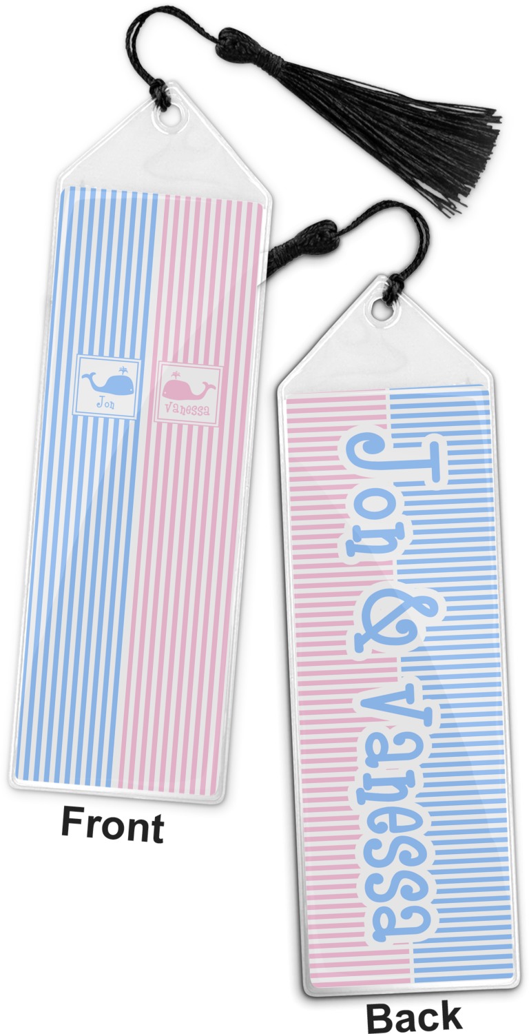 Your personalized bookmark is made of a sturdy, clear vinyl, and is approximately 7.5" x 2.25". We display your personalization on vinyl inserts that are placed on both sides. Accompanying each book marker is a black, fringe tassel that attaches to the reinforced, triangular header.