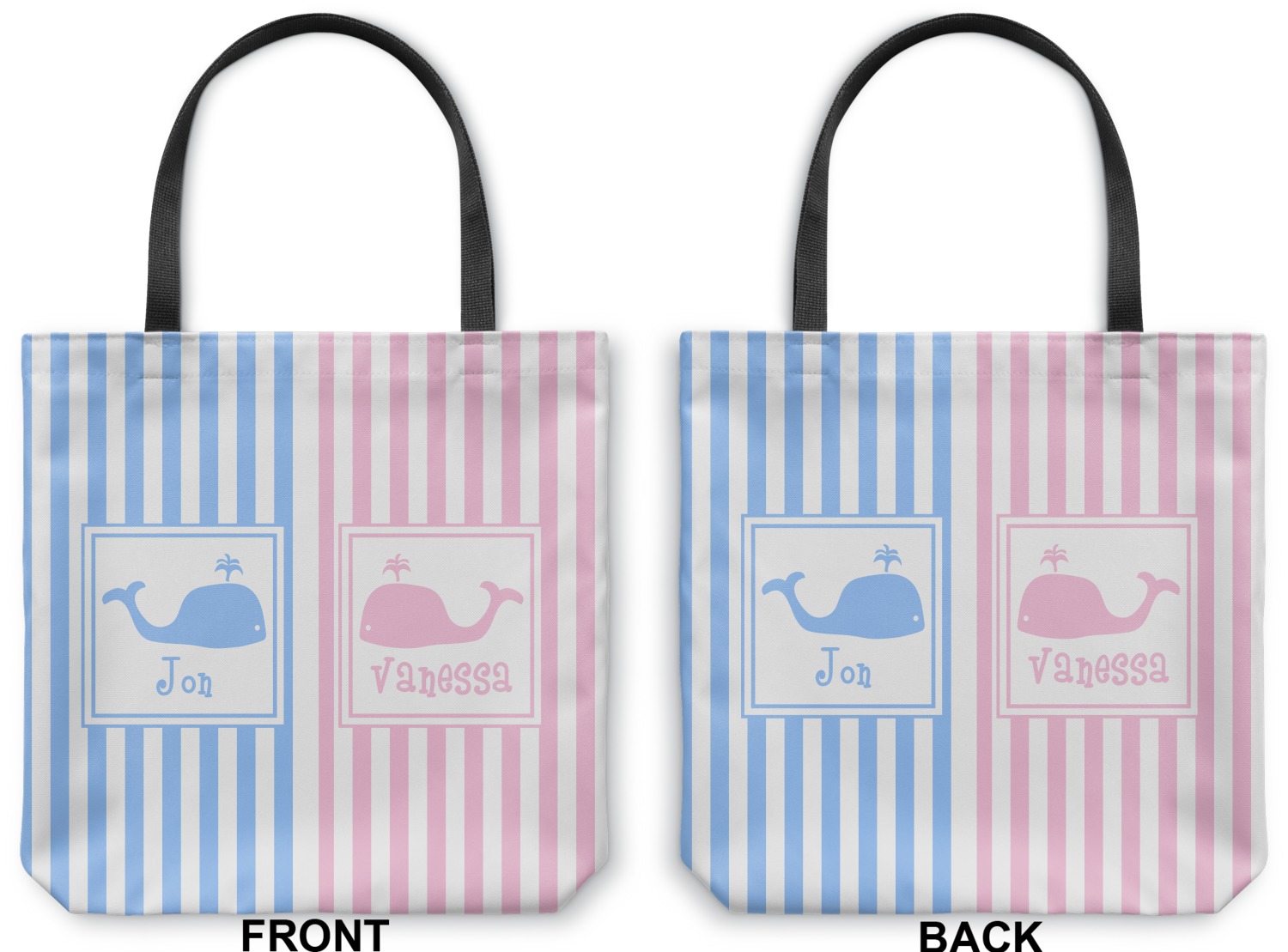 Our totes are made right here in the USA. Your design is printed on canvas fabric; the fabric is then cut and sewn on the sides and on the bottom to add an approximately 3.5 inch gusset. Black cotton handles are sewn in and reinforced. Your tote has a designs on both sides - the designs can be the same or different - the choice is yours. The inside of the tote has a black fused lining.