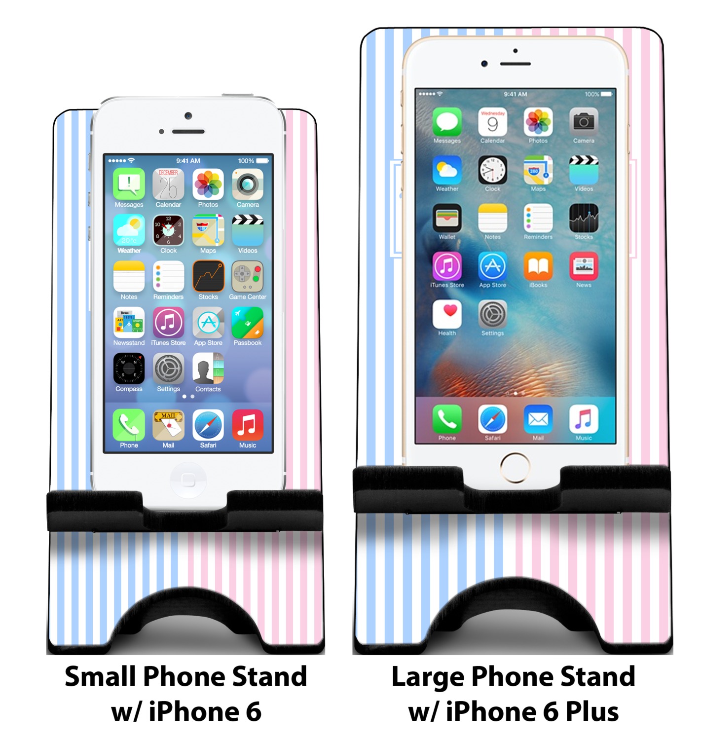 To meet your needs, we offer four variations of this IPhone stand. The backboard of the first version is shaped as a plain, yet sleek rectangle, and is available in two sizes. Our smaller size is approximately 4 by 3.25 by 7 inches, while the larger model is 4 by 3.77 by 8.5 inches. Alongside this model, we also provide you with a more decorative option. The upper part of our second version features a curved edge, for a classy, suave appearance. This phone holder is also sold in two sizes: a smaller version, which is 4 by 3.25 by 7 inches, and our larger model, which is 4 by 3.77 by 8.5 inches. Both models will support large phones, but the larger model is better if you wish to proudly display your personalized design.