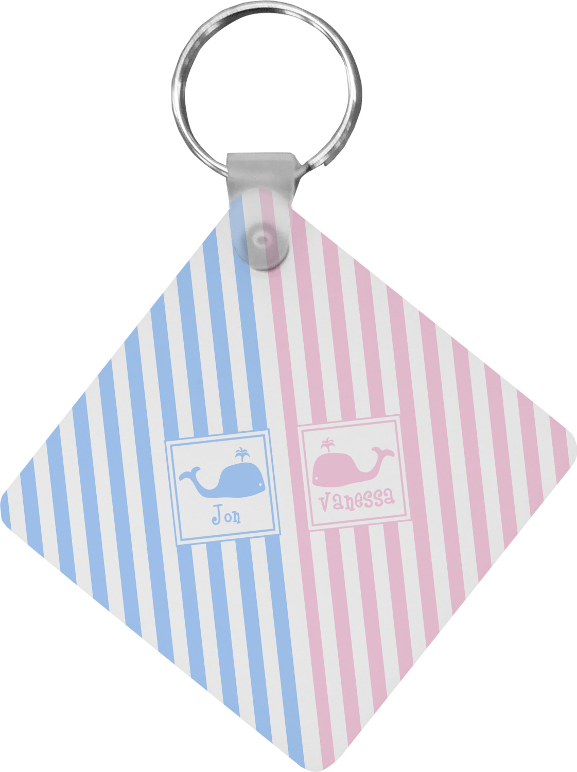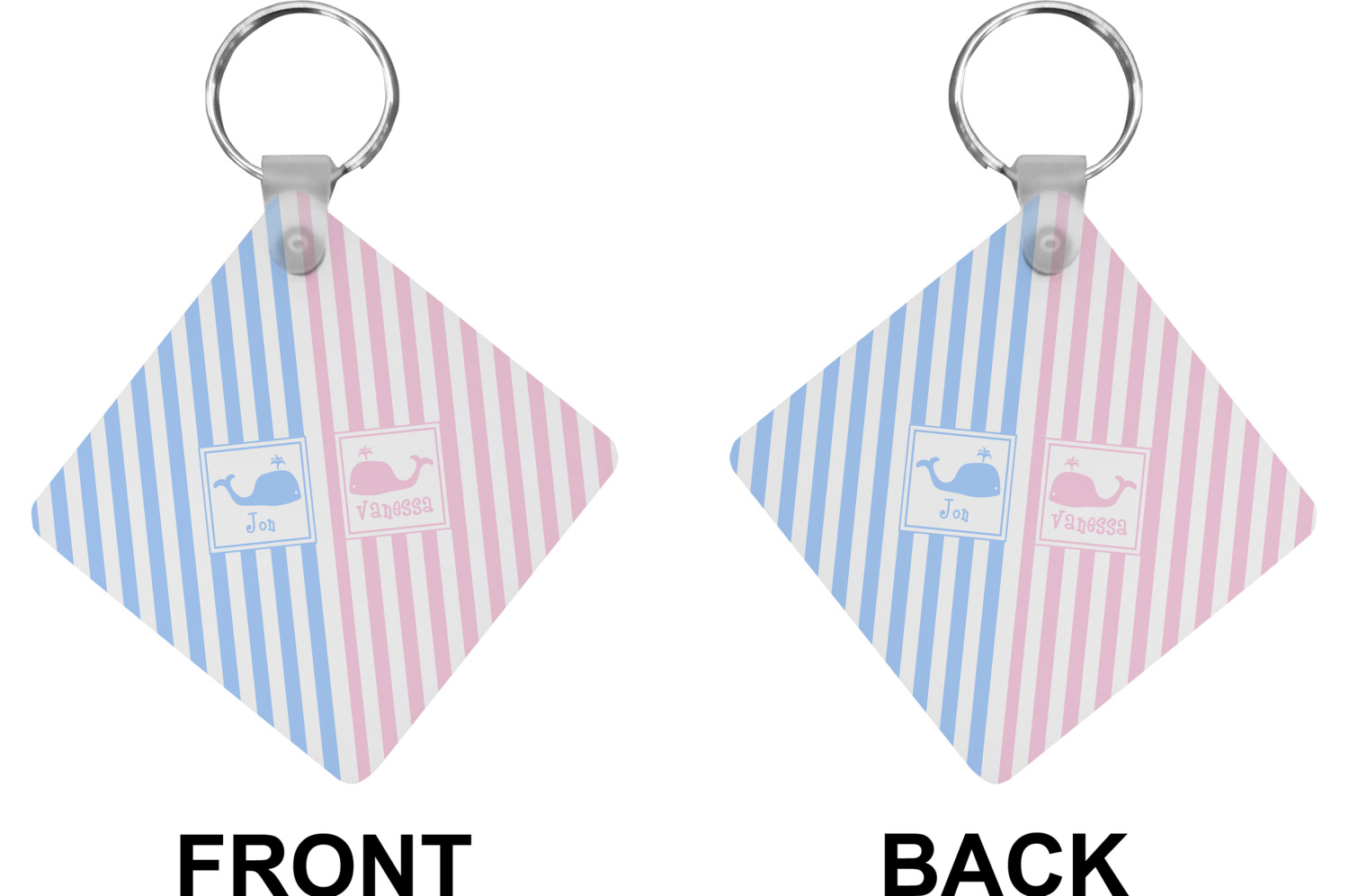 Our personalized keychains attach to the included metal, split key ring with a plastic, removable snap. Since a metal ring is included with your purchase, you have the liberty to keep your keys together on the ring, with or without your unique keychain. We offer this keychain in three different shapes: circle, heart, or diamond. We print your personalized design(s) on both sides of the key chain, and the surface has a glossy, reflective finish that only emphasizes your design. Each keychain is approximately 2.25 by 2.25 inches.