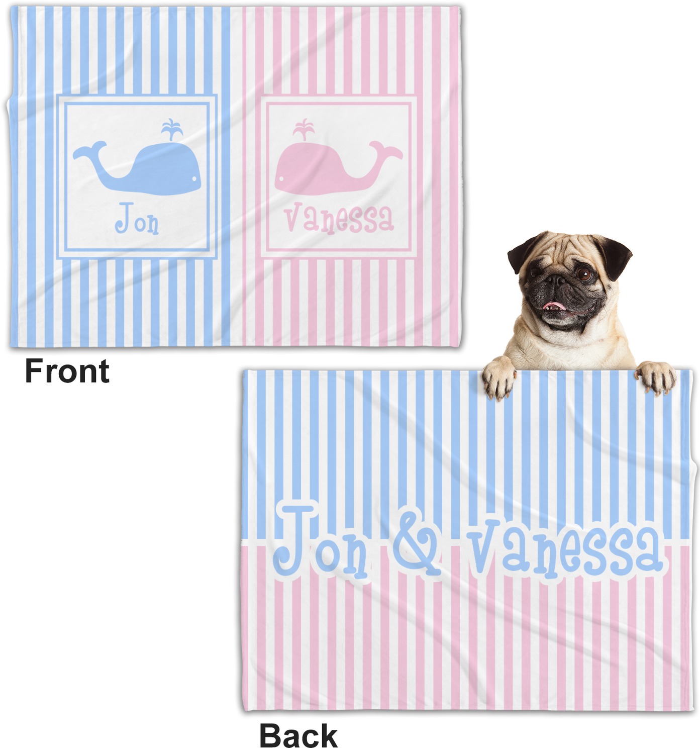 These dog blankets are crafted from a gentle, soft-to-the-touch, minky material. We print your customizations, either matching or differing, on both the top and underside of the blanket. These personalized dog blankets are available in two sizes: regular and large. Our regular size, at 40" x 30", accommodates small and some medium size dogs. At 60" x 50", our large dog blanket is a better fit for bigger breeds. Though specialized for dogs, these blankets still make a thoughtful gift for your favorite feline, or any other pet in mind!