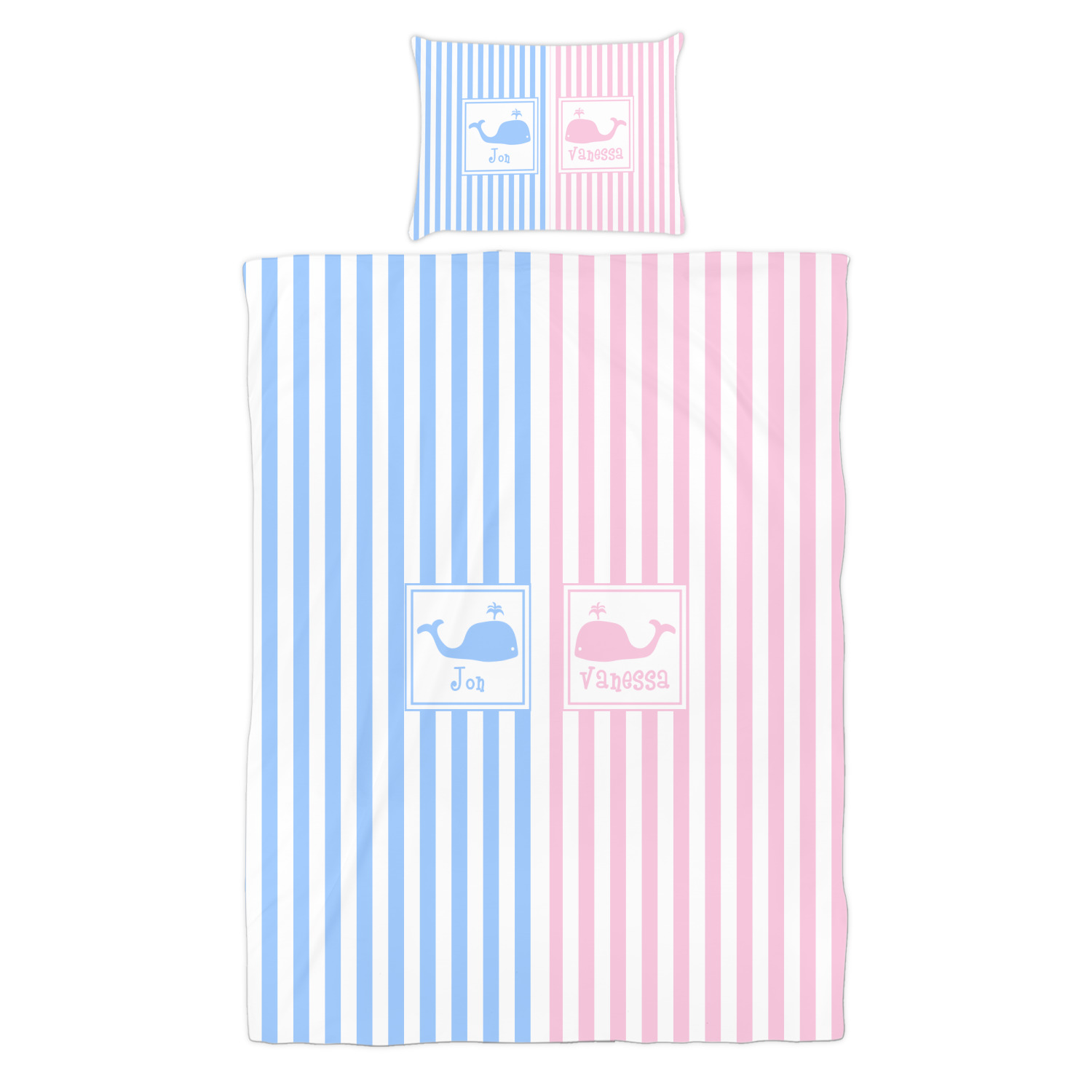 This striped design with whales is the perfect balance between masculine & feminine. It is the design style for sharing! One side is masculine with blue and the other side is feminine with pink.