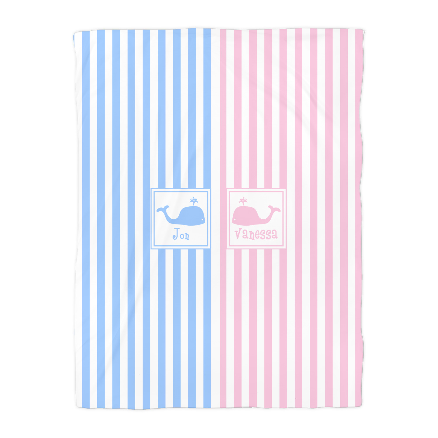 This striped design with whales is the perfect balance between masculine & feminine. It is the design style for sharing! One side is masculine with blue and the other side is feminine with pink.