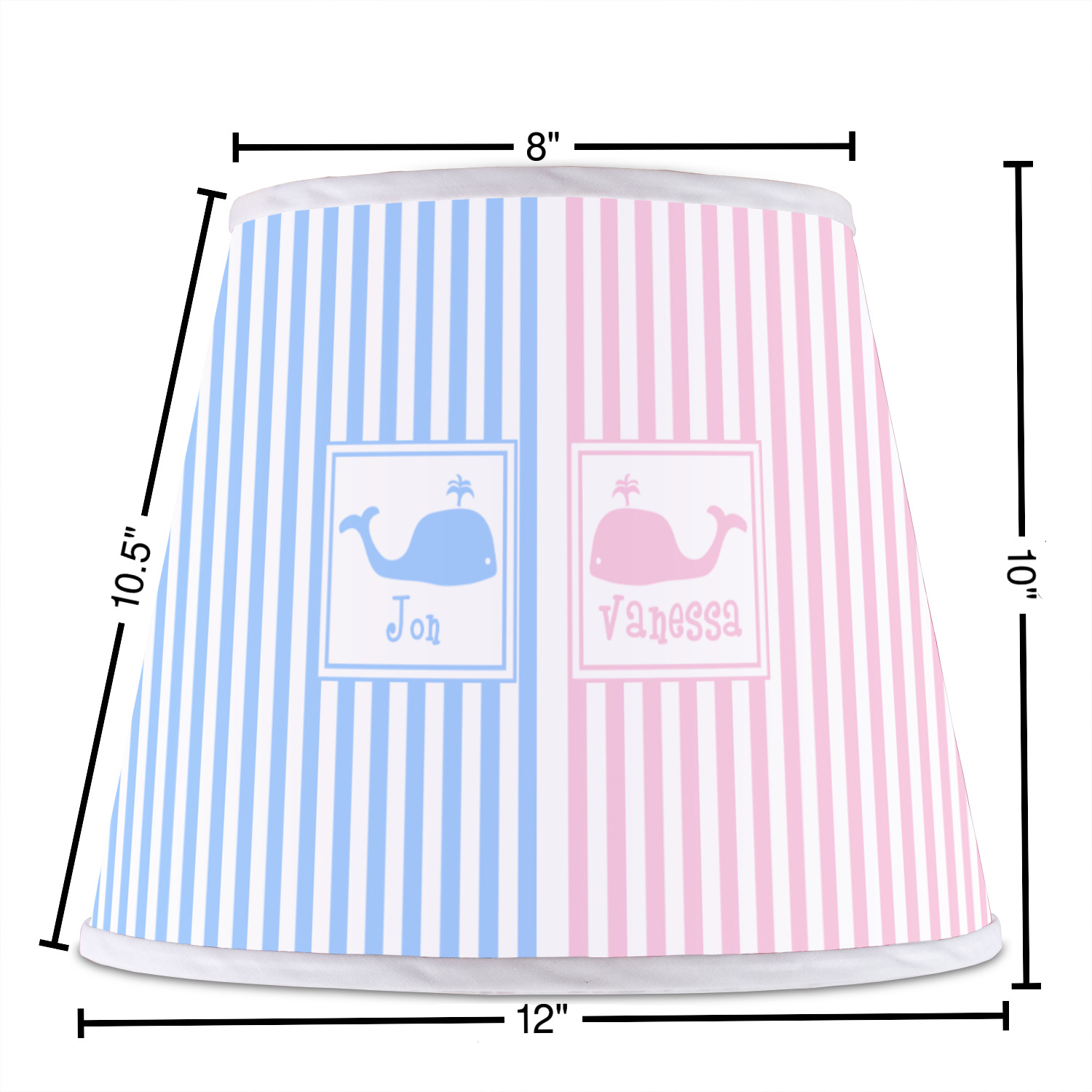 The base of this lampshade is 12 inches in diameter, and the top spans 8 inches in diameter. The total height of the lampshade is 10 inches. The angled nature of this custom lampshade concentrates the light, making it ideal for smaller spaces. This lampshade is made of matte, polyfilm, and displays your customization in its middle. The top and bottom of this colorful lamp shade are lined with a white fabric ribbon (which can be replaced with black inside the design studio) which frames your design and creates a sophisticated finish. As an UNO fitter lampshade, this unique lamp shade will fit a variety of bases.