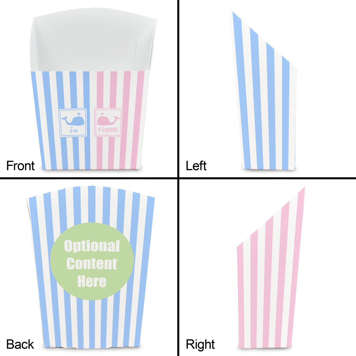 These favor boxes are printed in full color on quality cardstock - so coordinating the french fry favor boxes to match your event's themes or colors should be a breeze. You can upload your own design including artwork, logos or photos