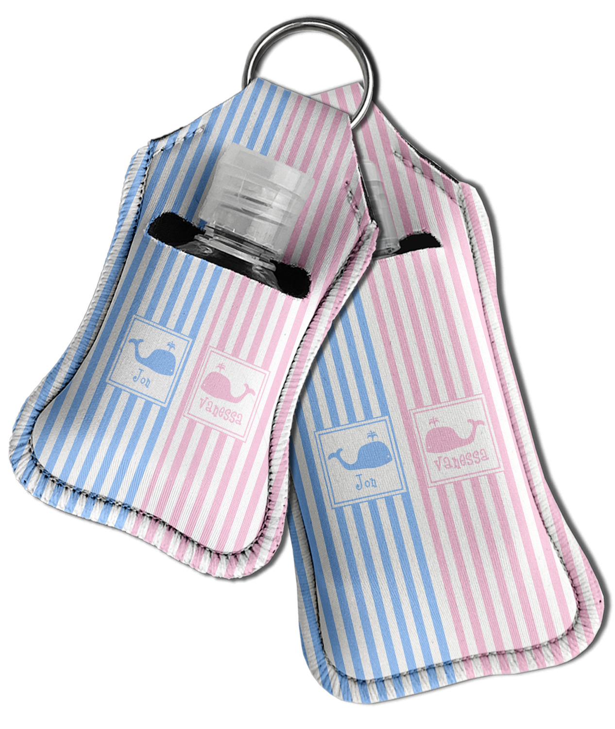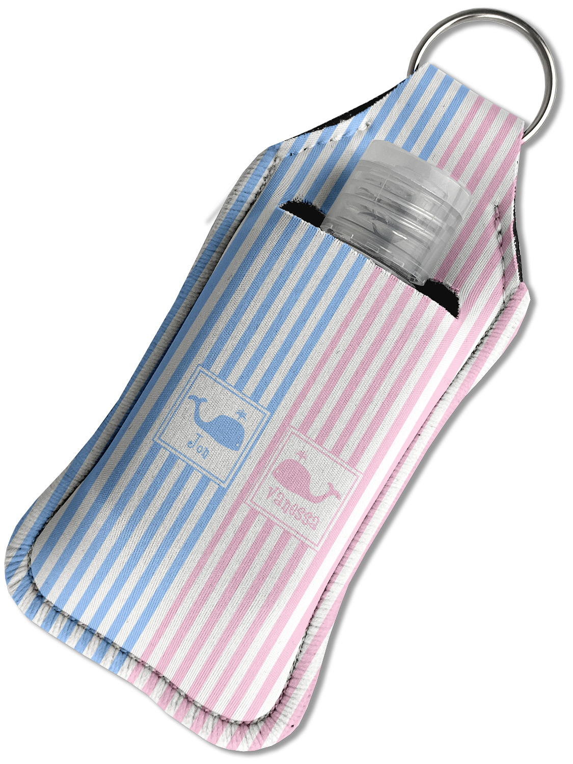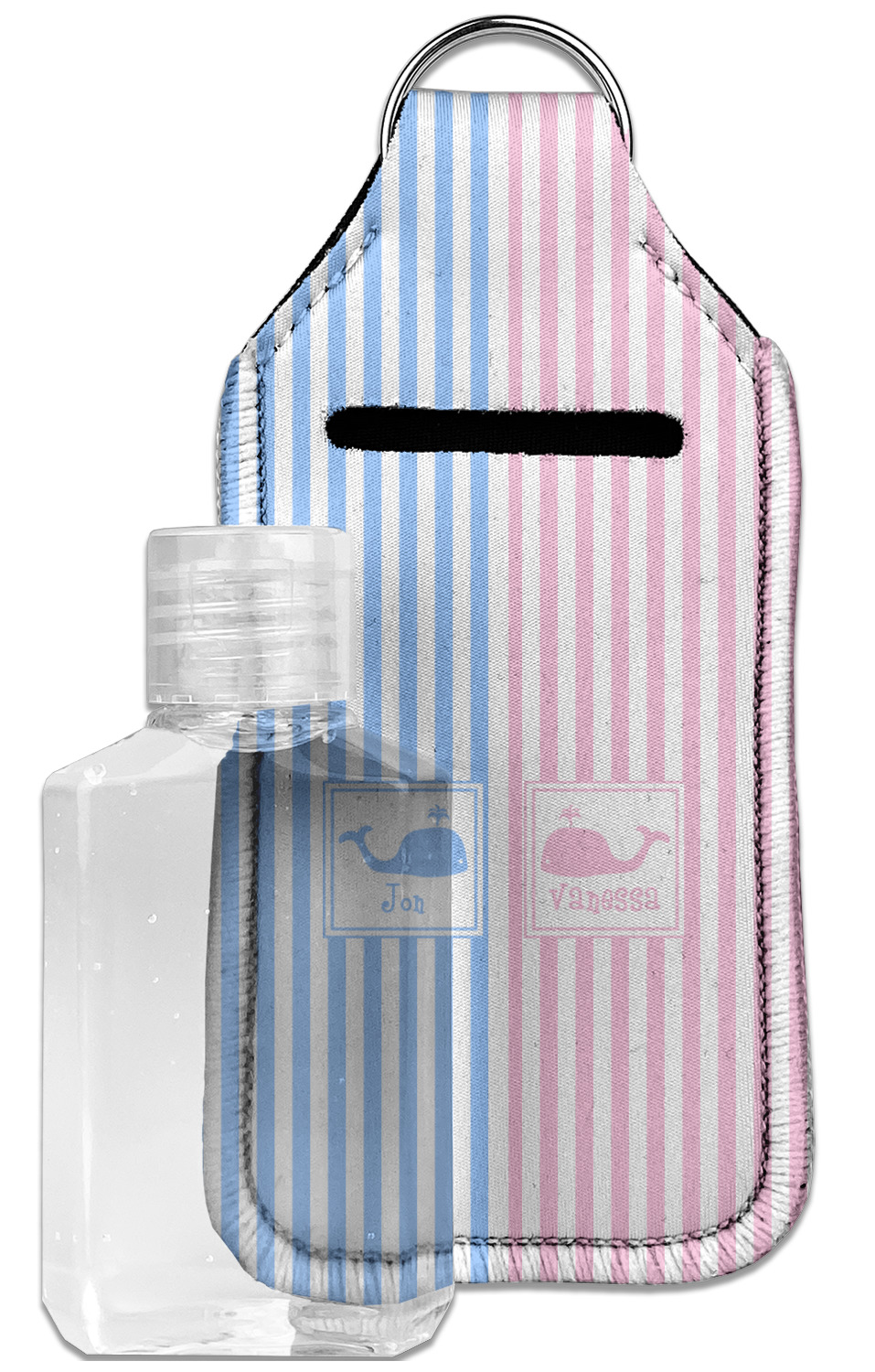 Each hand sanitizer holder comes with its own empty travel-sized, refillable hand sanitizer sure to fit snug in your customized sanitizer case! Our hand sanitizer cases are a durable, yet soft neoprene material sure to last any daily activities or travel agenda. Customize and personalize a hand sanitizer bottle holder with one of our two sizes - small (4.25" x 2.25") or large (5.5" x 2.5"). Each travel sanitizer holder comes with a keyring for attachment on bags, keys, or more!