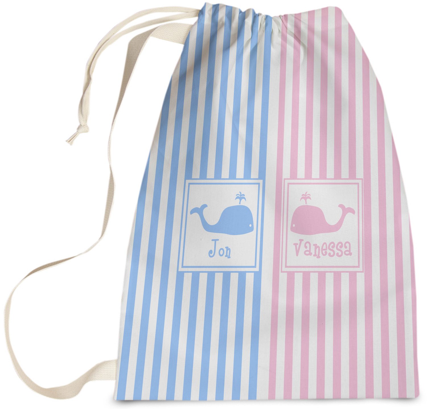 Carry your laundry in style with these customized laundry bags. Available in two sizes, featuring a natural colored woven strap and a cinch cord, these bags hold a lot of clothes or anything else you want to fit in them.