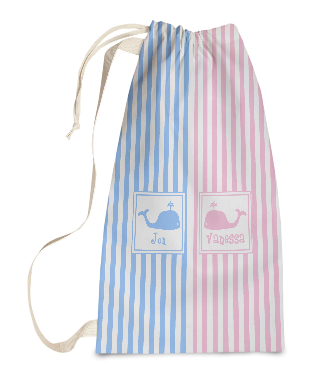 Carry your laundry in style with these customized laundry bags. Available in two sizes, featuring a natural colored woven strap and a cinch cord, these bags hold a lot of clothes or anything else you want to fit in them.