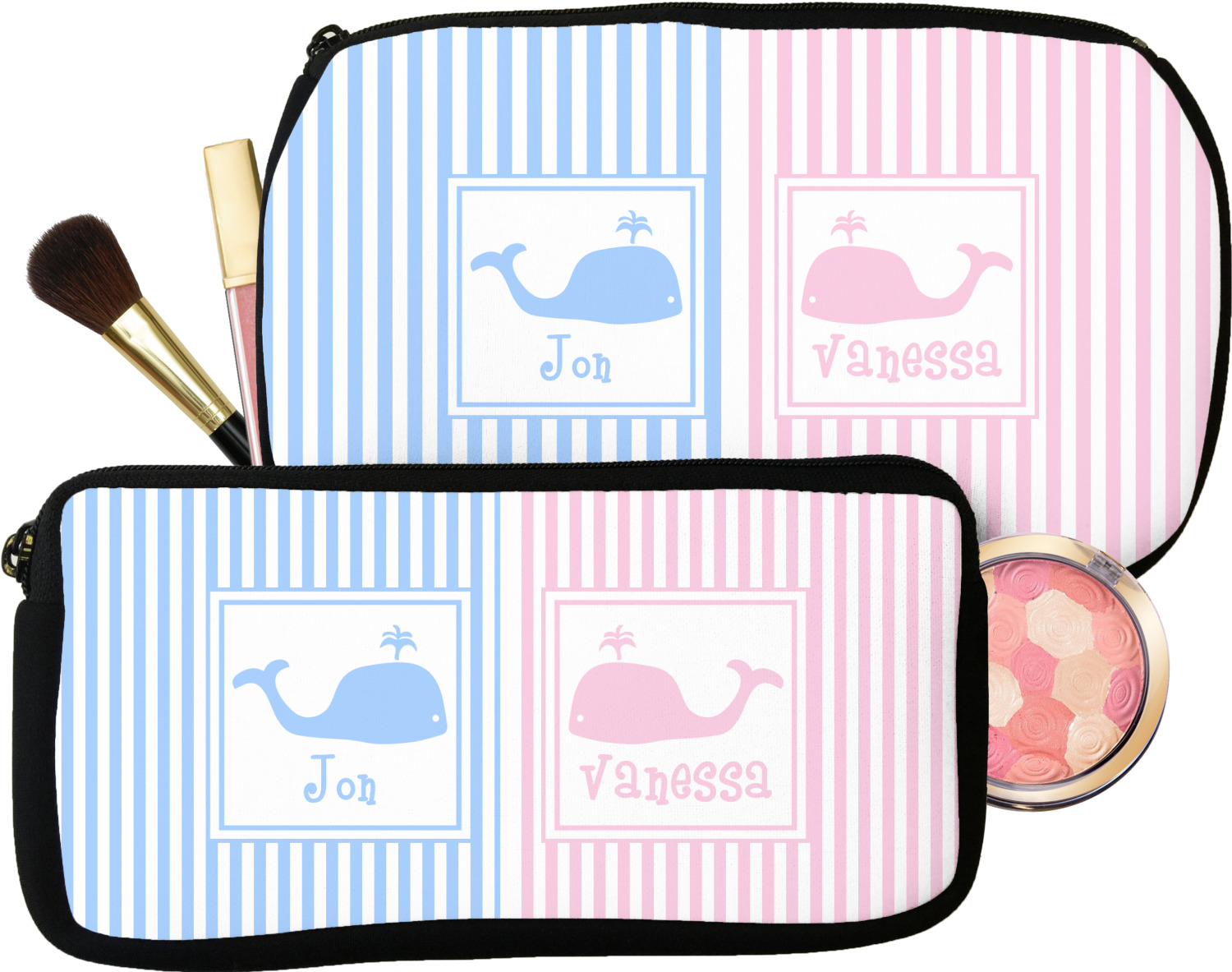 Our personalized makeup bags are available in many different designs, patterns and colors - so you are sure to find one that will love. They are made of neoprene (same material as wet-suits) and thus are water resistant, so spillages in your makeup bag will not end up all over you purse. They are customized on one side and are black on the other side and the zipper is black as well.