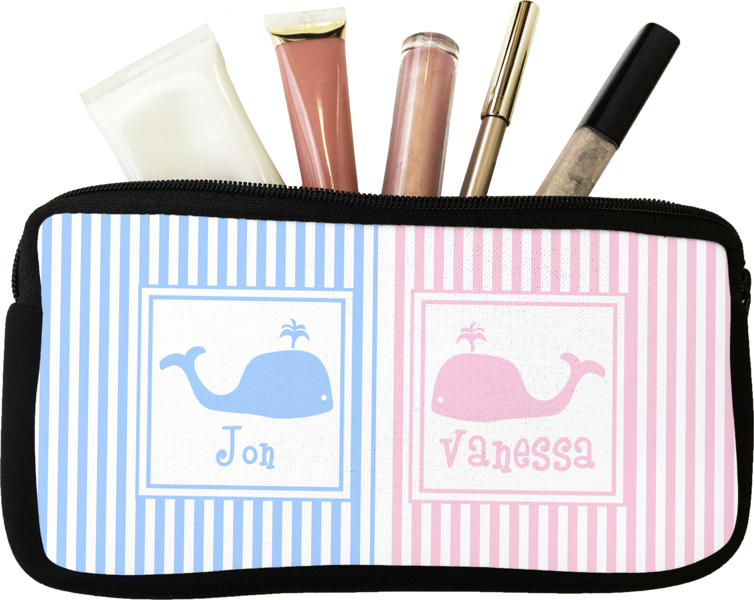 Our personalized makeup bags are available in many different designs, patterns and colors - so you are sure to find one that will love. They are made of neoprene (same material as wet-suits) and thus are water resistant, so spillages in your makeup bag will not end up all over you purse. They are customized on one side and are black on the other side and the zipper is black as well.