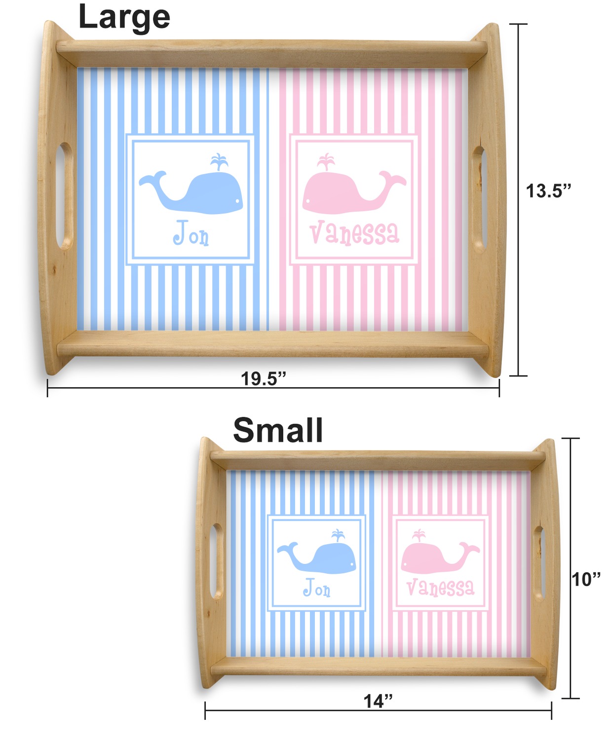This serving tray with handles features square edges and two rounded sides, creating a very modern look. Each side is fabricated from a beautifully cut, natural wood. The bottom of the interior of the tray displays your customized design in bright, vibrant color. The tray is sold in both a black color and a natural wood look. Each variation of the wood serving tray has two sizes: Small, which is 14" x 10" x 2.25", and Large, which is 19.5" x 13.5" x 2.75".