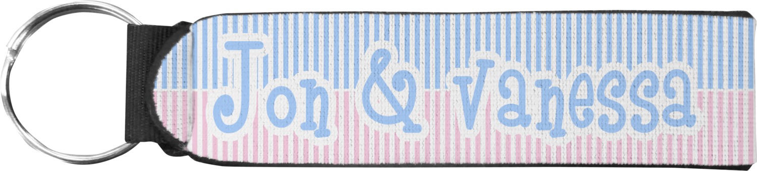 Made from neoprene, these key fob wristlets are comfortable, cushioned, easy to slip on and off; these traits allow it to maintain a slim, yet fashionable appearance, all while optimizing your efficiency. When attaching or removing keys, simply squeeze open the included metal ring. These fobs measure at around 4 inches, and have a bit of a stretch. Thus, they are best suited for small to medium size wrists. If you require a larger size, check out our webbing keychain fob for larger sizing.