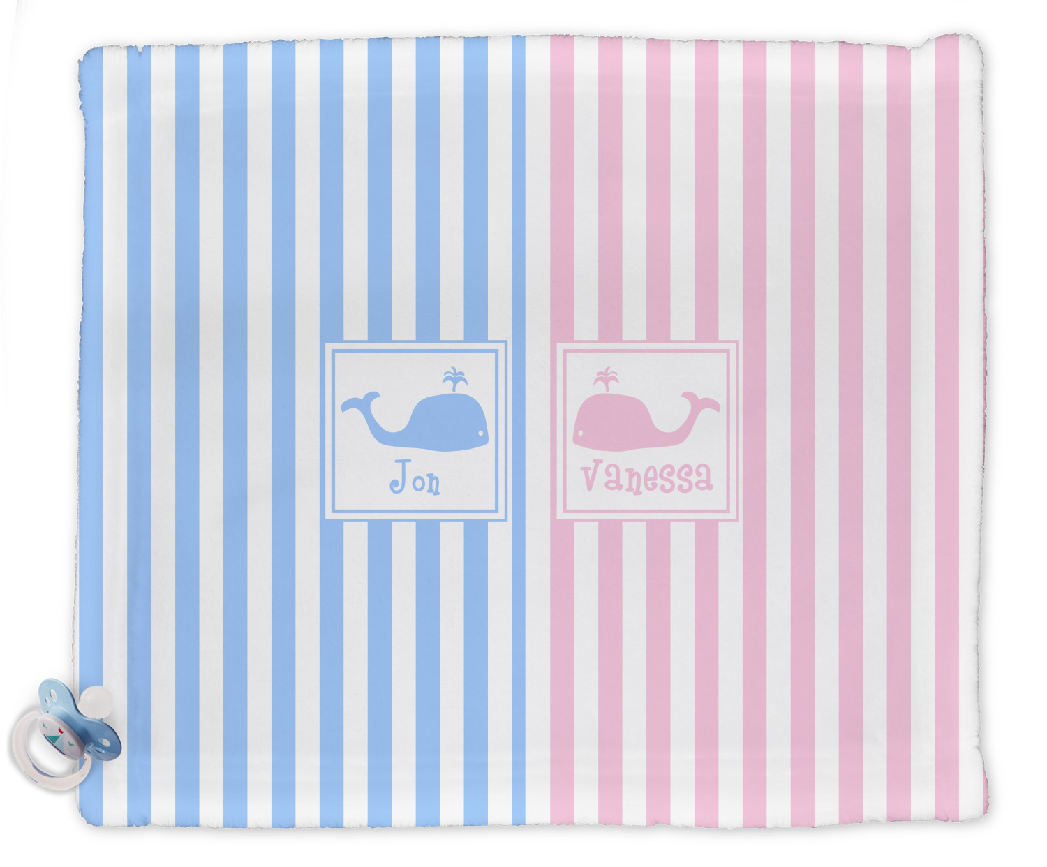 This striped design with whales is the perfect balance between masculine & feminine. It is the design style for sharing! One side is masculine with blue and the other side is feminine with pink.
