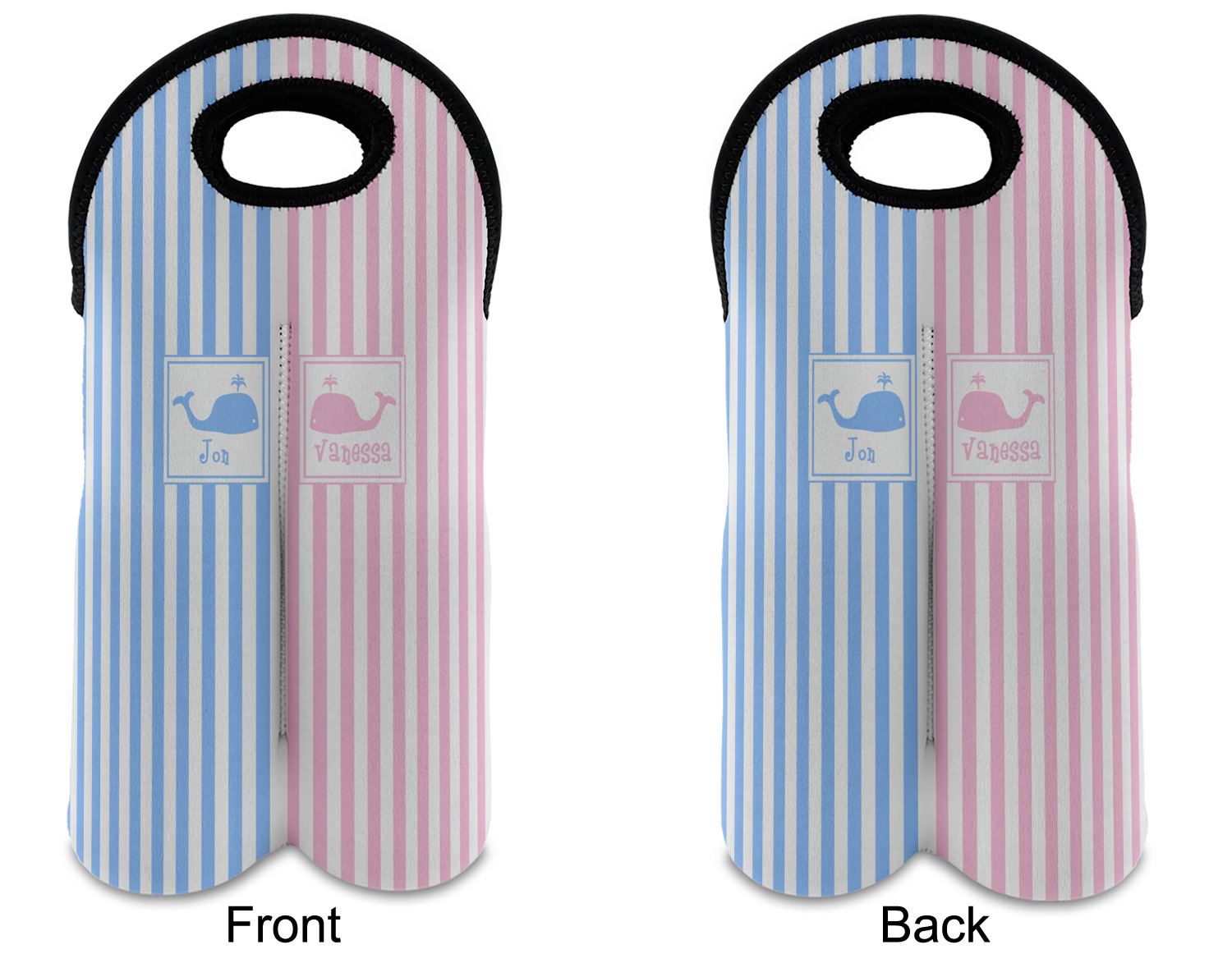 These tote bags are insulated to keep the bottles cold and have a stitched separation down the middle and double handles to keep the two bottles safe and secure during travels.