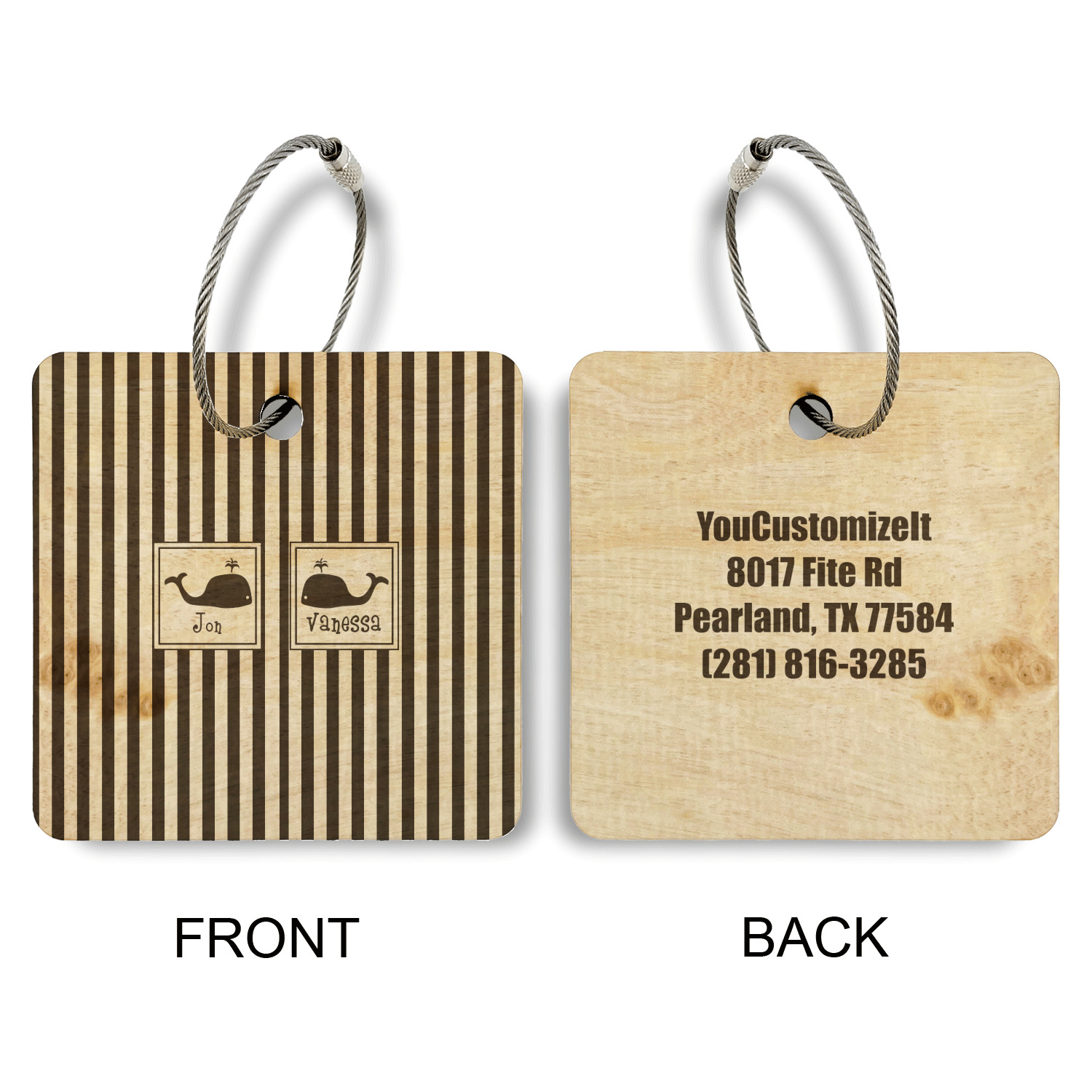 Made from a premium hardwood, these luggage tags are laser engraved and cut just for you. The front contains your design of choice and the back has your contact information to ensure your luggage gets back to you if ever lost.