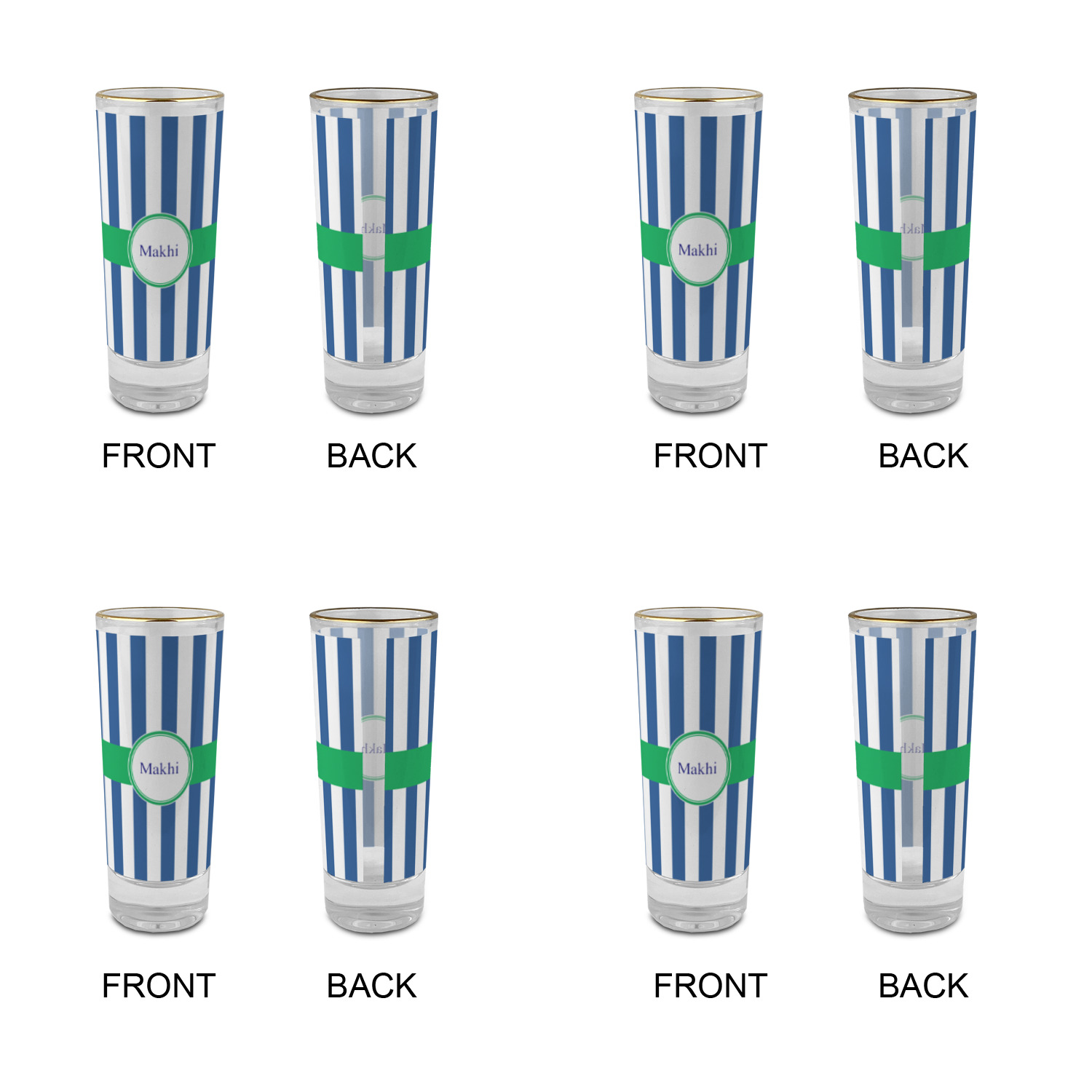 These glass shooter glasses are printed in full color with the design of your choice. These are a tall shooter 2 oz size and stand 4" tall. The print is a full wrap design to boldly display your personalization.