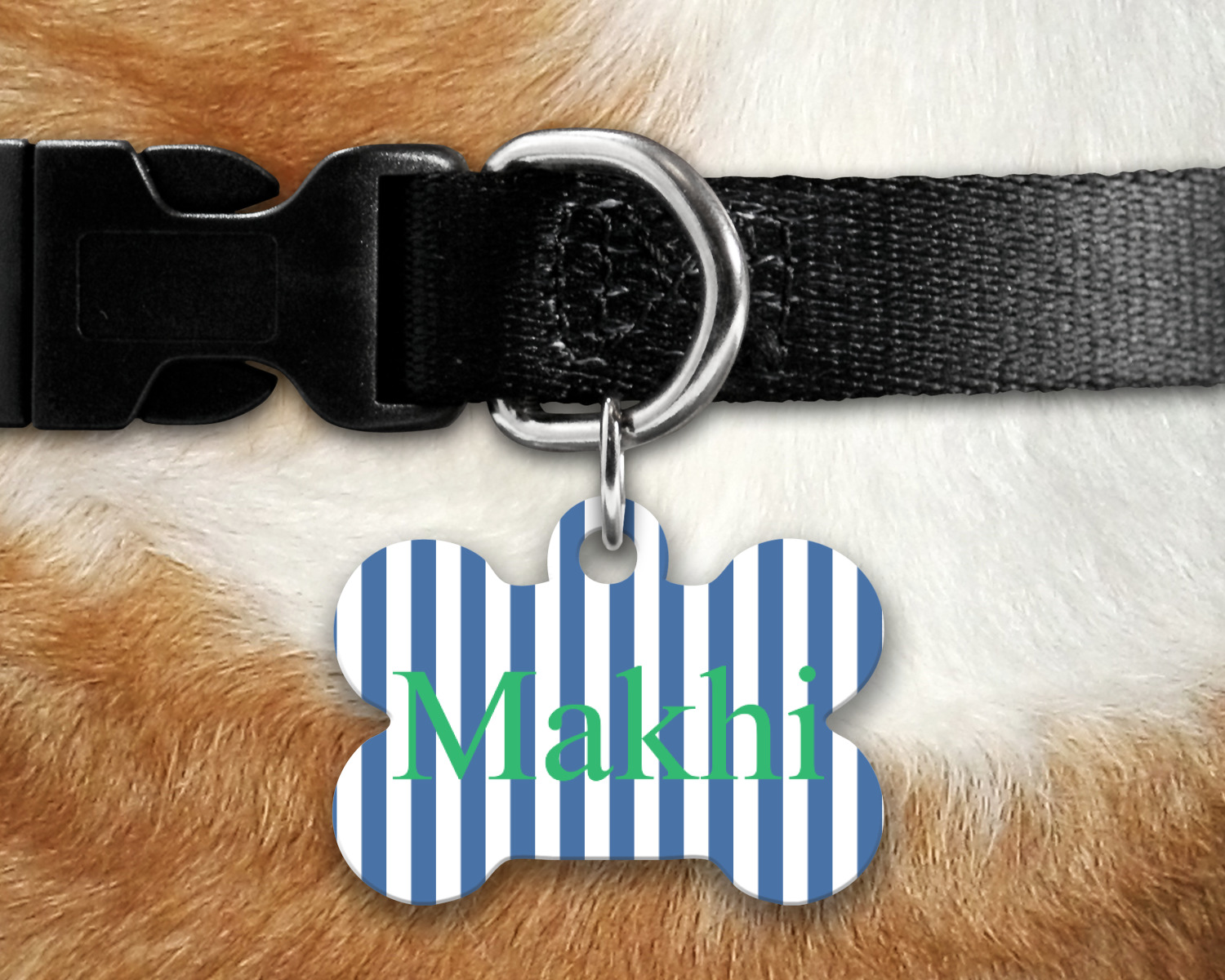 Our default design templates print your dog's personalization on the front and your contact information on the back; however everything is customizable, so you customize the patterns, the colors, the personalization, the contact information etc.