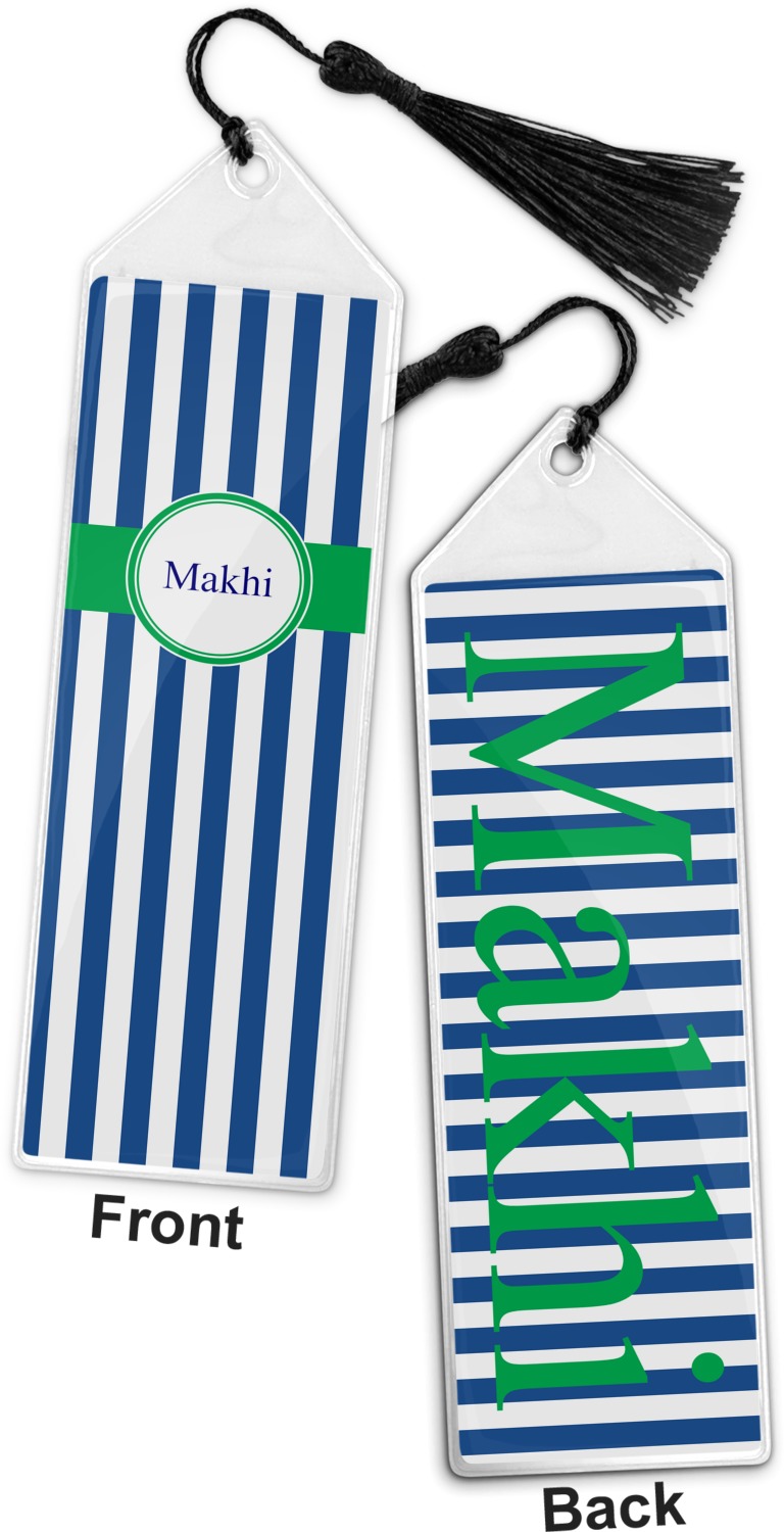 Your personalized bookmark is made of a sturdy, clear vinyl, and is approximately 7.5" x 2.25". We display your personalization on vinyl inserts that are placed on both sides. Accompanying each book marker is a black, fringe tassel that attaches to the reinforced, triangular header.