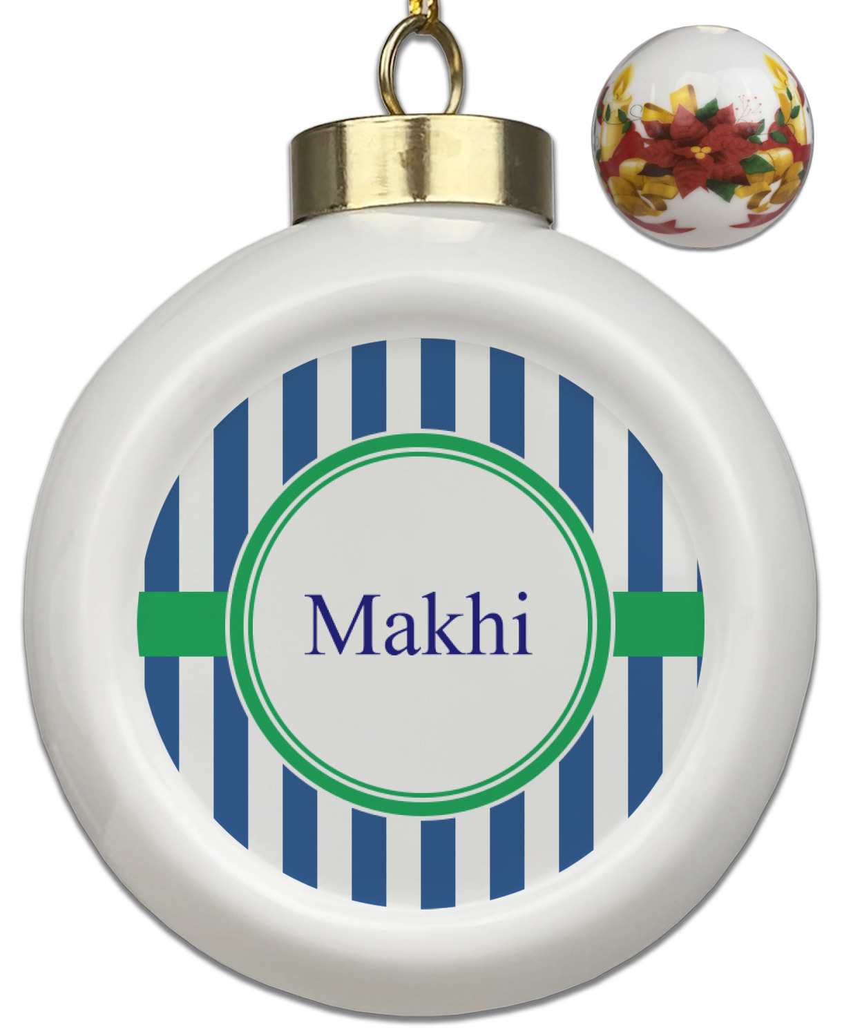 Our Christmas ornaments are a unique ceramic ball shape with a twist as it has a flat face to display your custom design! Select from one of our two design types - Christmas Tree or Poinsettia Garland - to adorn the curved back of your personal design. Each ornament measures 3H x 2.5W x 2D accompanied with a gold string accent for finishing touches to hang on your beautiful Christmas tree!