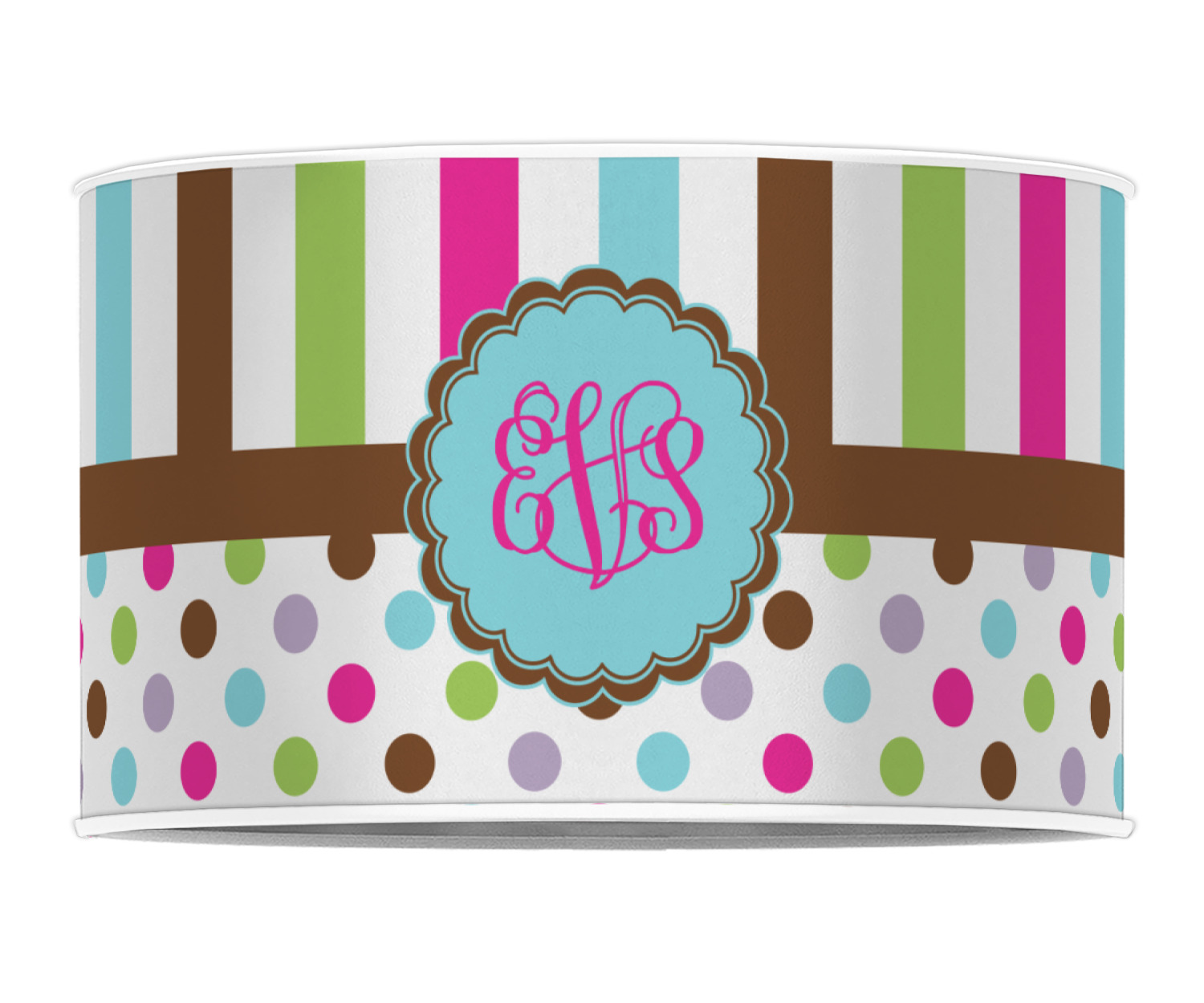 I scream, you scream, we all scream for ice cream! Yummy ice cream colors inspired this design. Chocolate, strawberry, vanilla, cotton candy blue, and lime sherbert are all represented. The top is a traditional striped pattern. On the bottom the same colors are sprinkled about. A lovely chocolate band separates the two patterns.