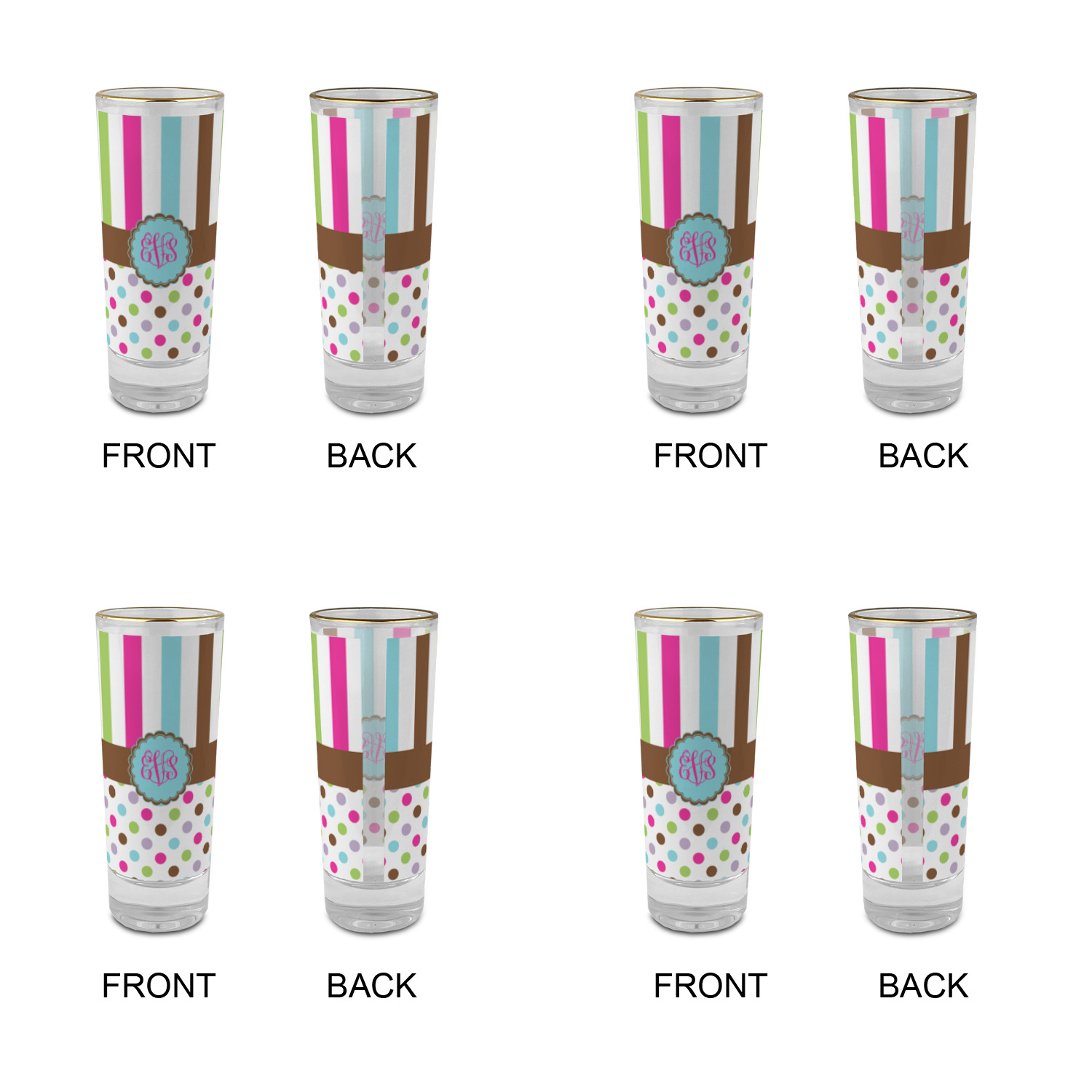These glass shooter glasses are printed in full color with the design of your choice. These are a tall shooter 2 oz size and stand 4" tall. The print is a full wrap design to boldly display your personalization.