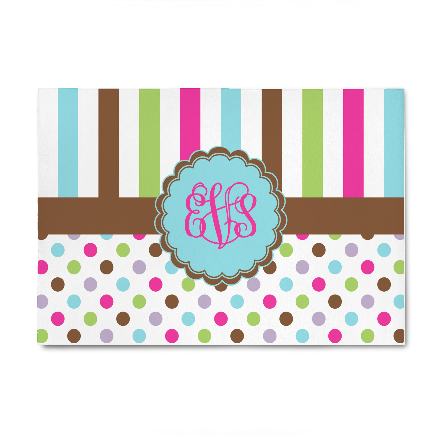 I scream, you scream, we all scream for ice cream! Yummy ice cream colors inspired this design. Chocolate, strawberry, vanilla, cotton candy blue, and lime sherbert are all represented. The top is a traditional striped pattern. On the bottom the same colors are sprinkled about. A lovely chocolate band separates the two patterns.