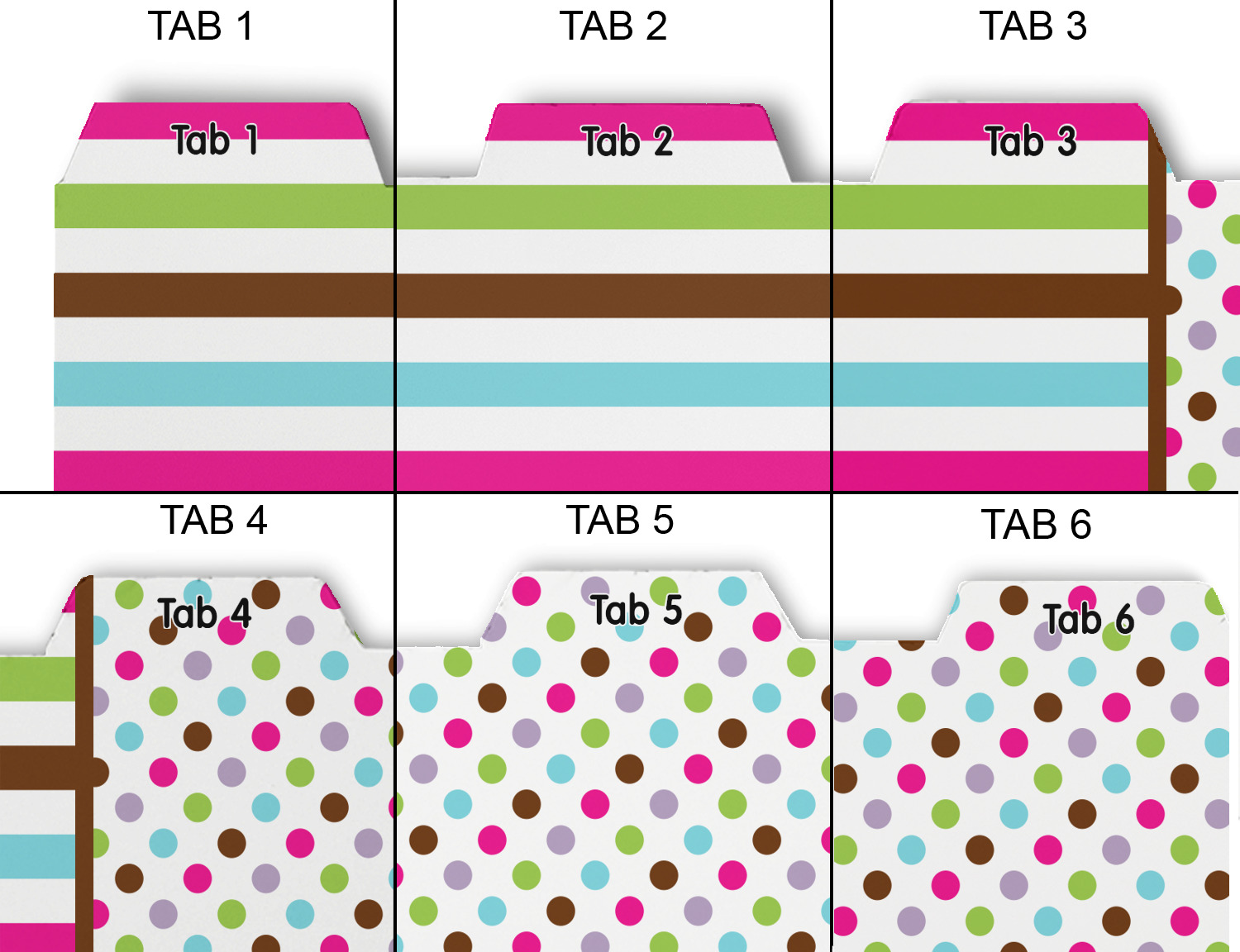 Whether you use binders at school or at work, we have designs to suit all of them. Available in 5 or 6 tab sets, you are sure to find a set to suit your needs. The back of each one is white and can be used to take notes, write vital information on, etc.