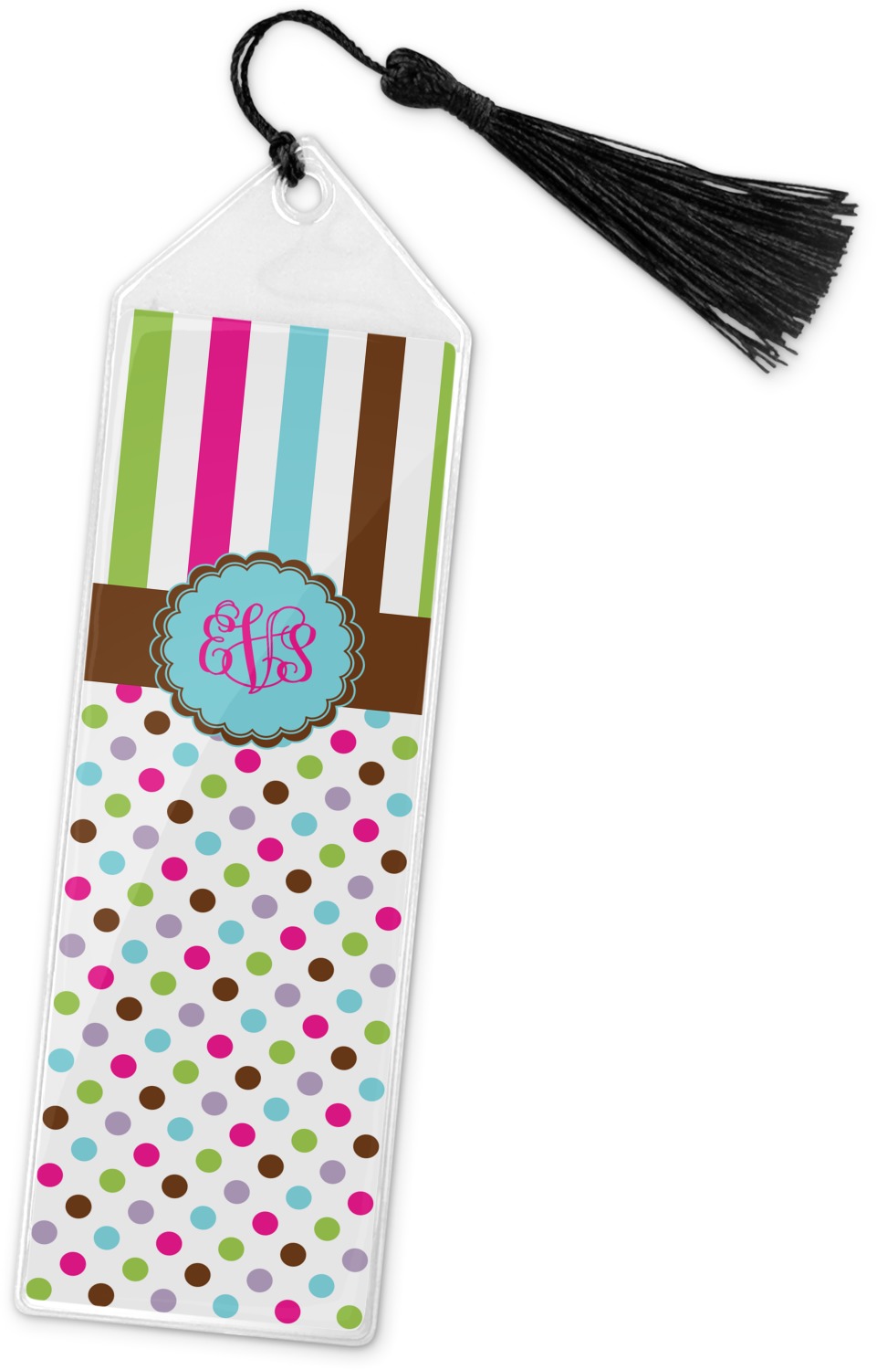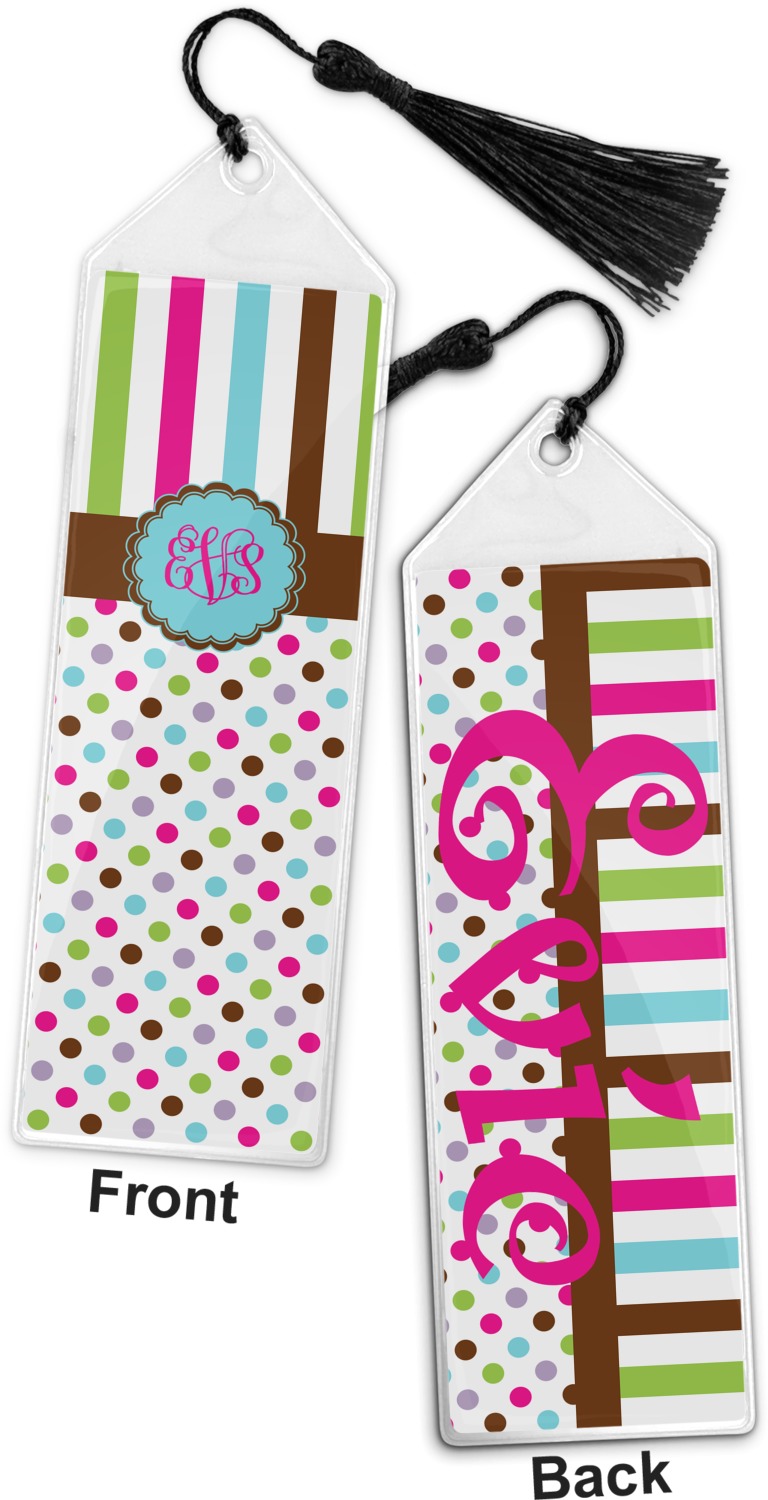 Your personalized bookmark is made of a sturdy, clear vinyl, and is approximately 7.5" x 2.25". We display your personalization on vinyl inserts that are placed on both sides. Accompanying each book marker is a black, fringe tassel that attaches to the reinforced, triangular header.